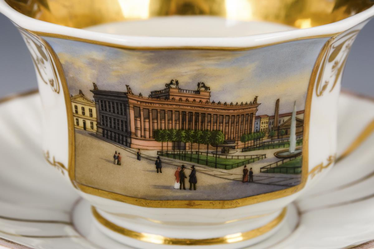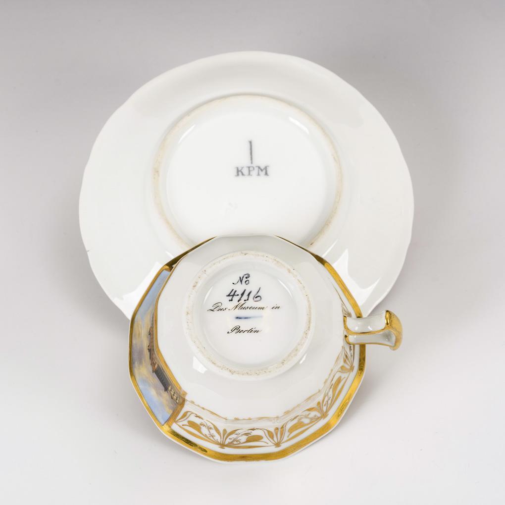 Polygonale, gefußte Glockentasse mit spitz geschweiftem Henkel. Schauseitig eine goldgerahmte Rechteckkartusche mit der Darstellung des Alten Museums in Berlin. Minimaler Goldabrieb.