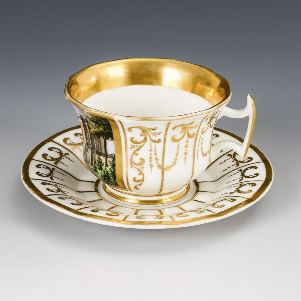 Polychrom bemalt, goldstaffiert. H Tasse 6 cm, Ø originale Untertasse 14,5 cm.
