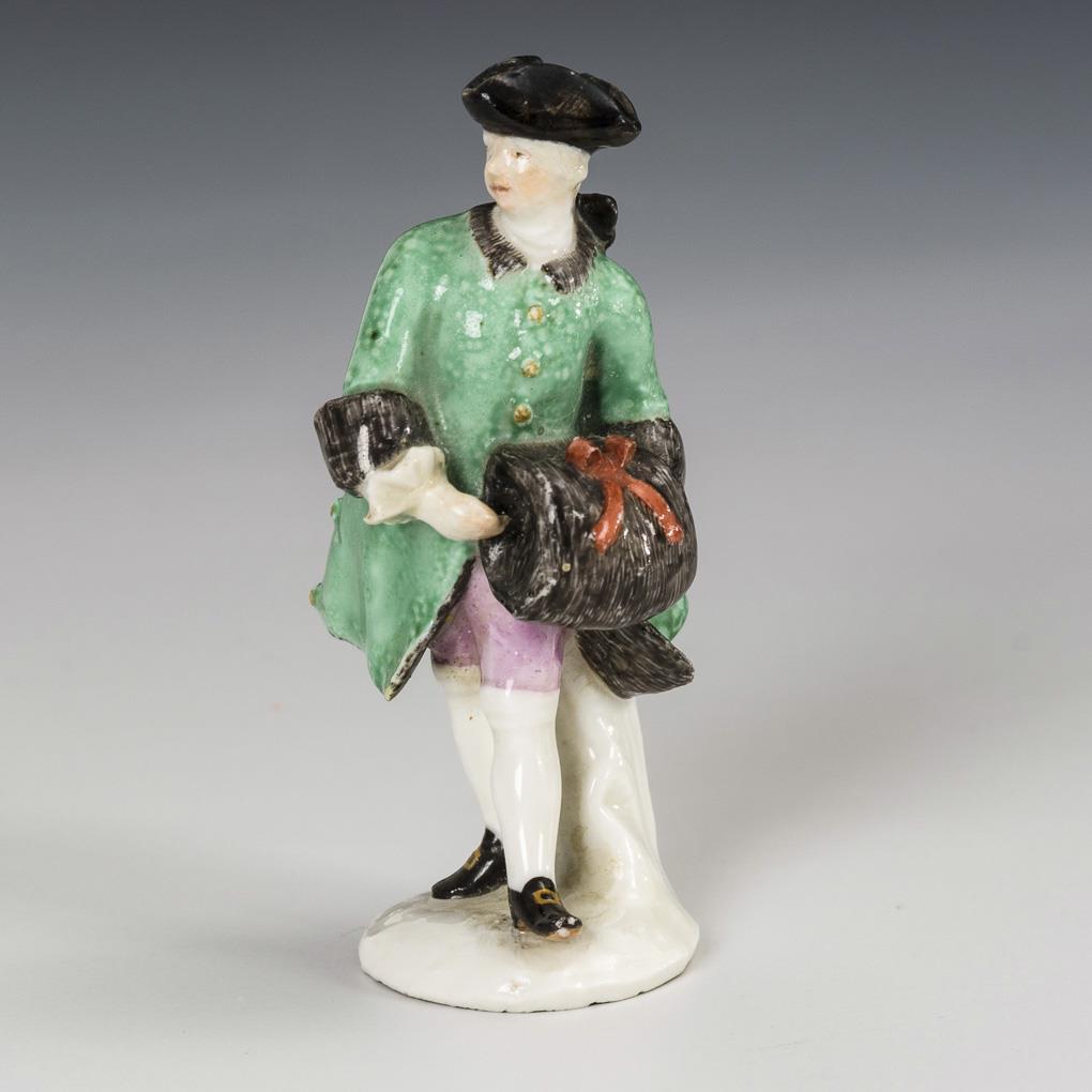 Entwurf von Johann Joachim Kaendler (1706 Dresden - 1775 Meißen) und Peter Reinicke (1715 Danzig - 1768 Meißen). Stehender Herr mit großem Muff. Hut und rechte Hand restauriert.