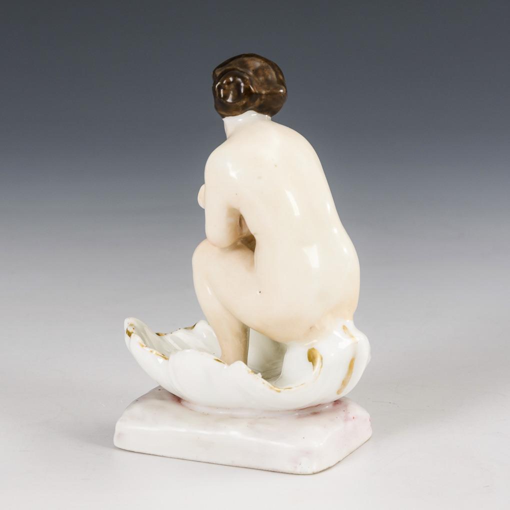 In einer Muschelschale hockender Akt einer jungen Frau. Gold berieben, 2 Chips am Sockelrand.