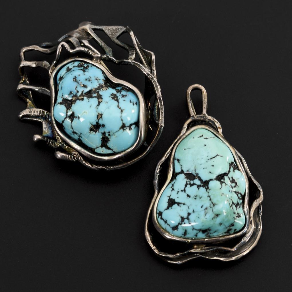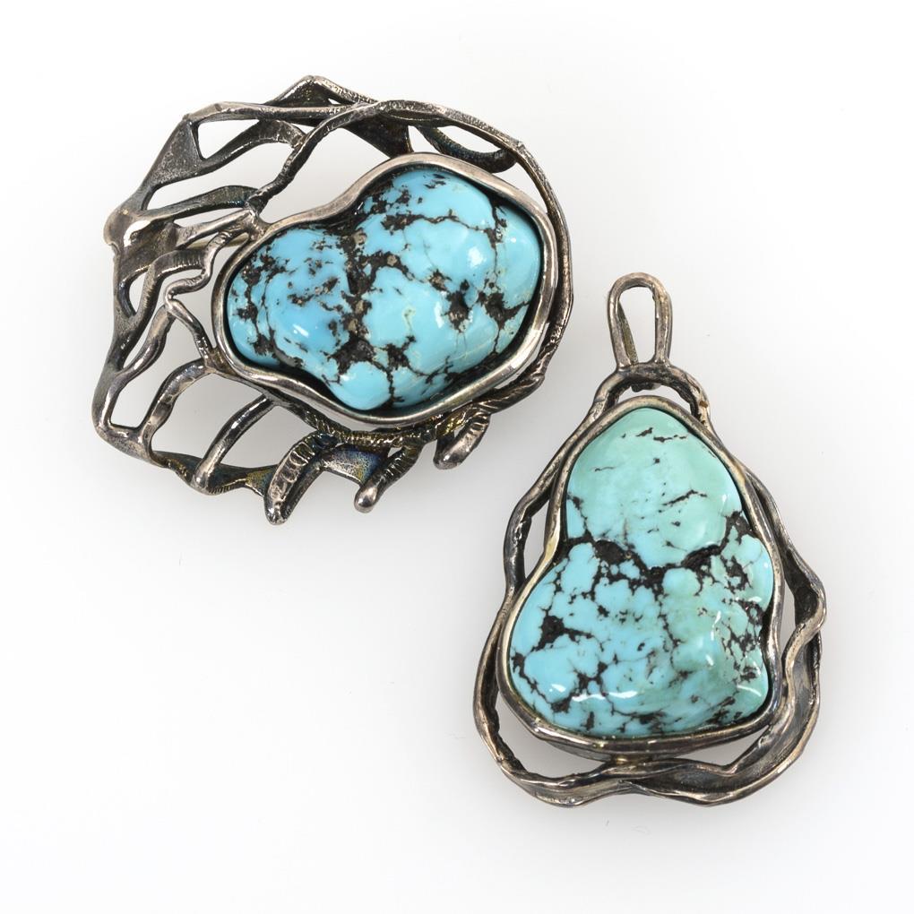 Silber 835 gestempelt. Anhänger 4,3 x 2,9 cm. Brosche 4 x 3,5 cm.. 14,4/17,3 g.