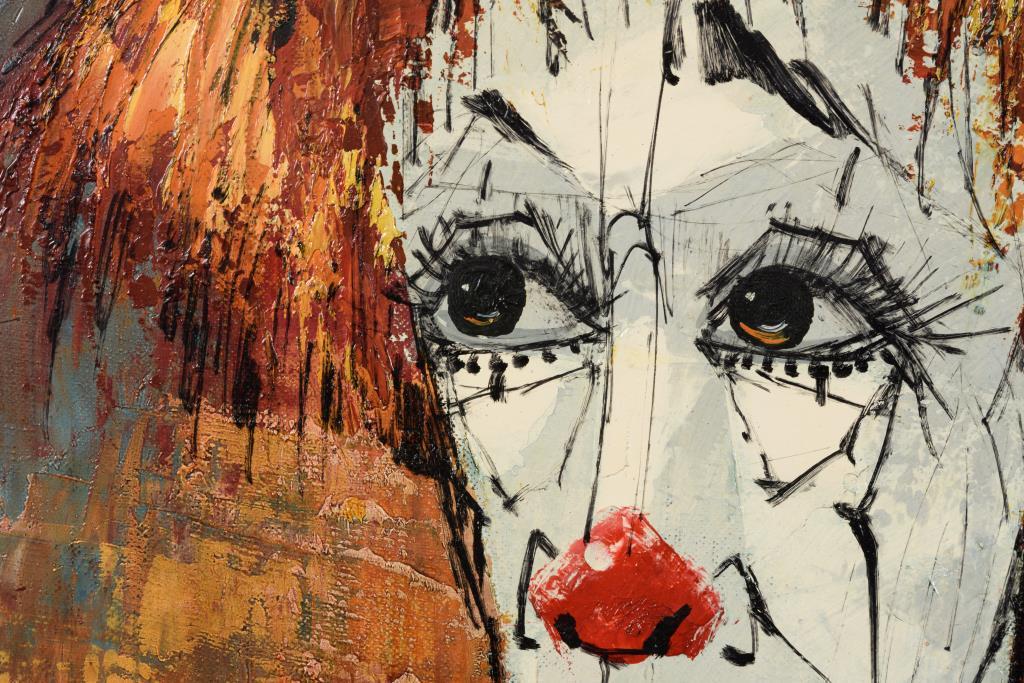 Porträt eines Harlekins vor abstraktem Hintergrund.