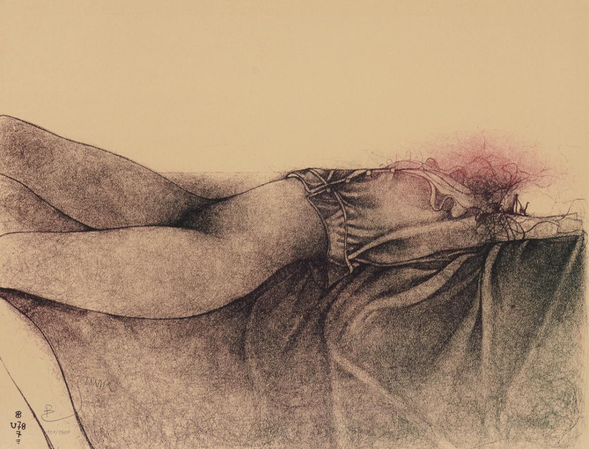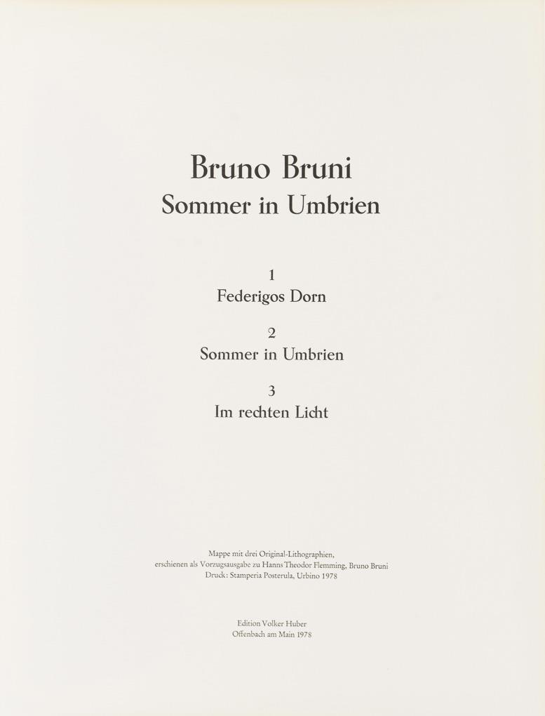 Stoffbezogene, braune Mappe mit 3 Original-Lithografien: "Federigos Dorn" | "Sommer in Umbrien" und "Im rechten Licht"; mit Titelblatt, Vorzugsausgabe zu Hanns Theodor Flemming, Edition Volker Huber. Mappe mit Fleck.