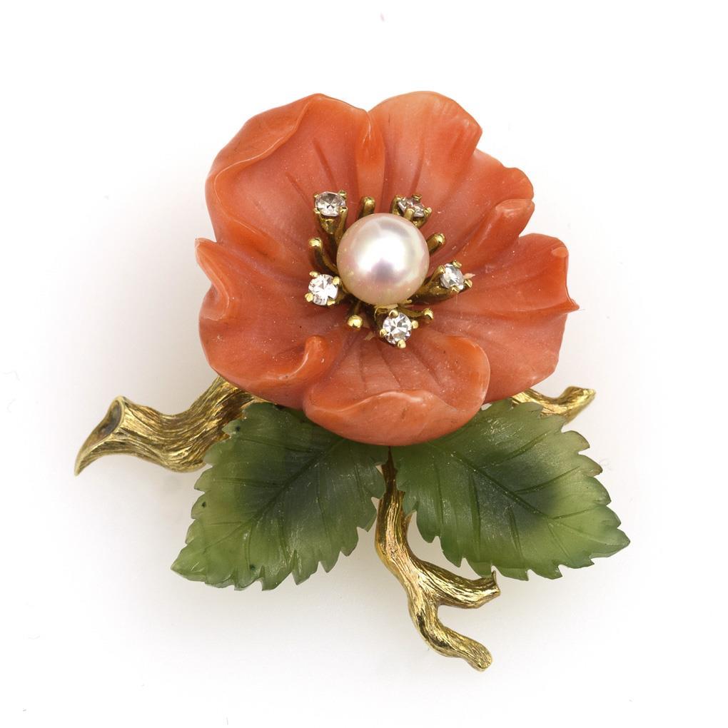 Geschnittene Korallenrose mit Zuchtperle, 5 kleinen Diamanten und 2 Nephritblättern. Starre Öse.