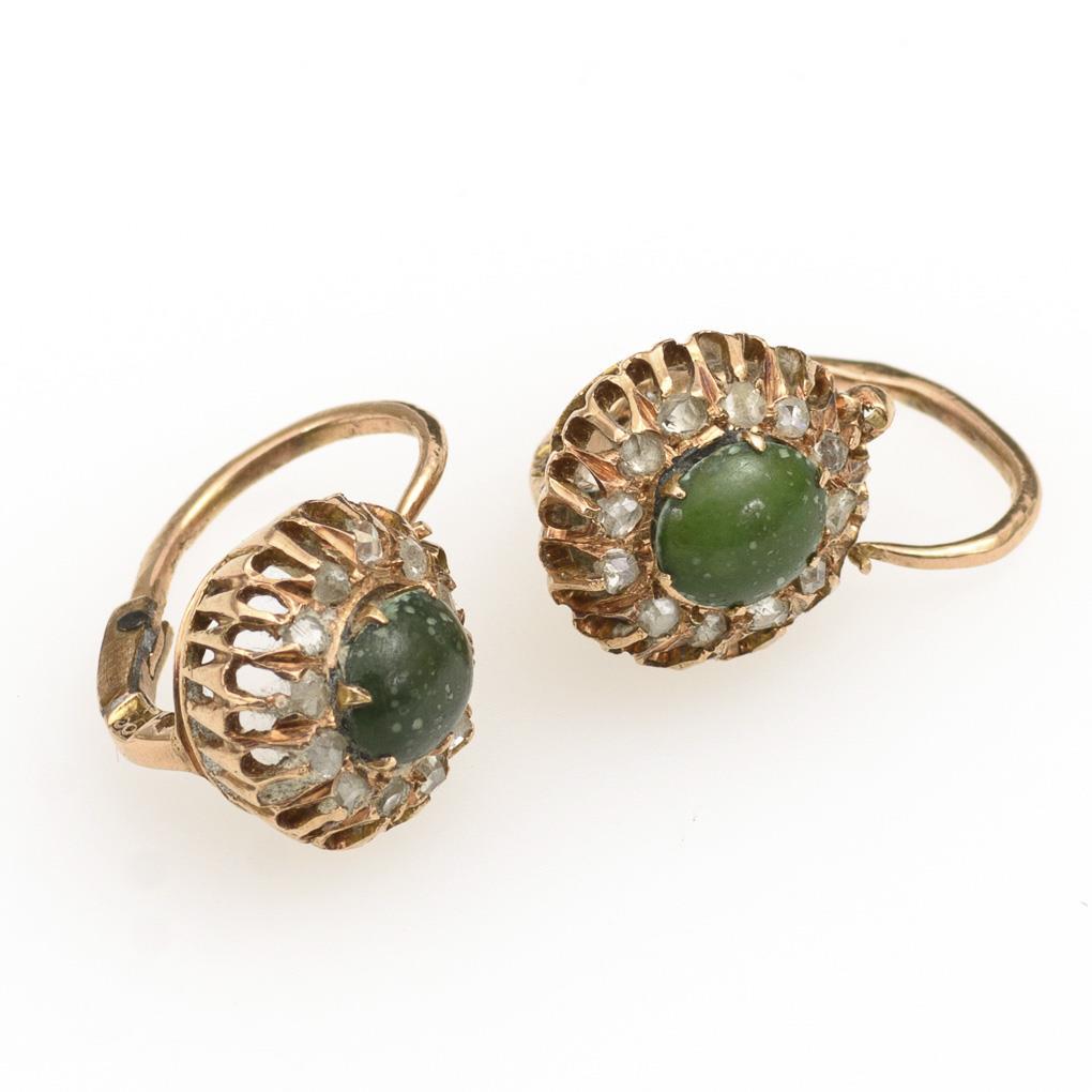 Russisches Ohrhängerpaar mit grünem Stein und Diamantrosen.