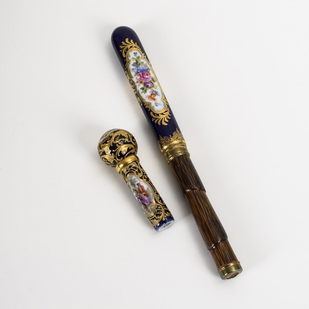 Porzellan bemalt, Metall vergoldet, Makassar-Ebenholz(?). L gesamt maximal 20 cm.