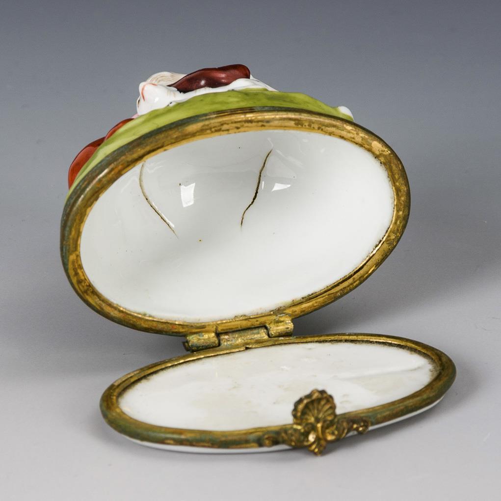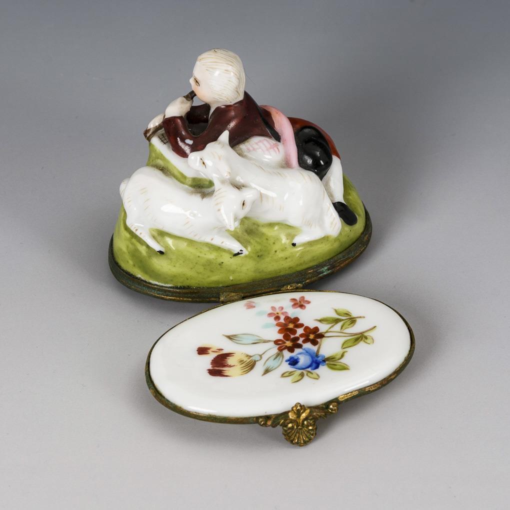 Ovale Tabatiere, auf dem Deckel die plastische Darstellung eines flötespielenden Schäferknaben mit Hund und 2 Schafen. Im Deckelinneren 2 Brandrisse, 3 Glasurabplatzer an der Jacke des Knaben.