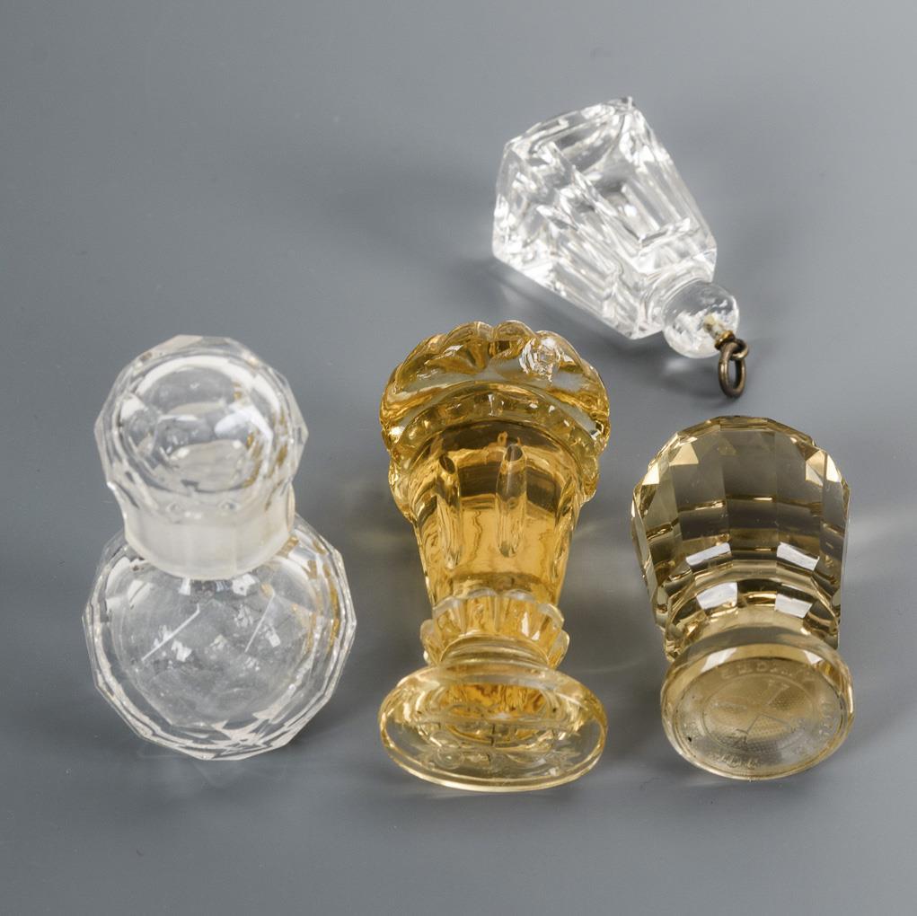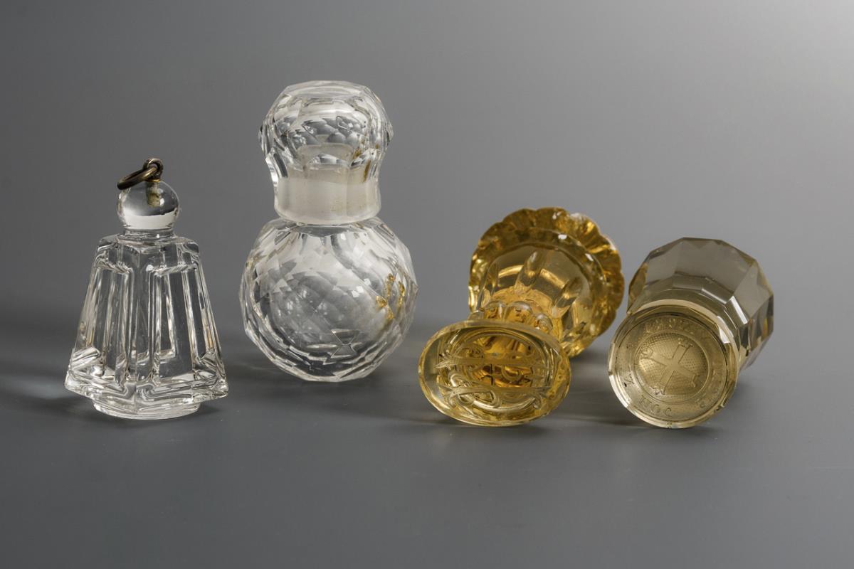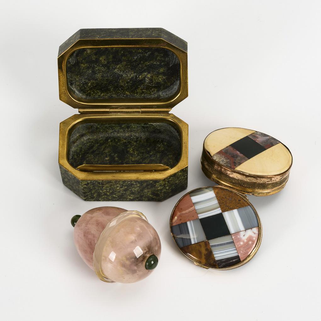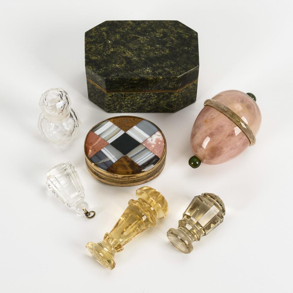 Oblonge Diabas-Dose. Ovale Dose mit Achat und Jaspis sowie goldfarbener Montierung. Klingelknopf in Eiform aus Rosenquarz mit Bergkristall. 2 Citrin-Petschafte mit Gravur („HL“ bzw. „In hoc signo vincit“ mit Kreuz). Bergkristall-Berlocke oder -Typar. Miniaturflacon aus geschliffenem Glas. Einige Alters-/Gebrauchsspuren an der ovalen Dose.