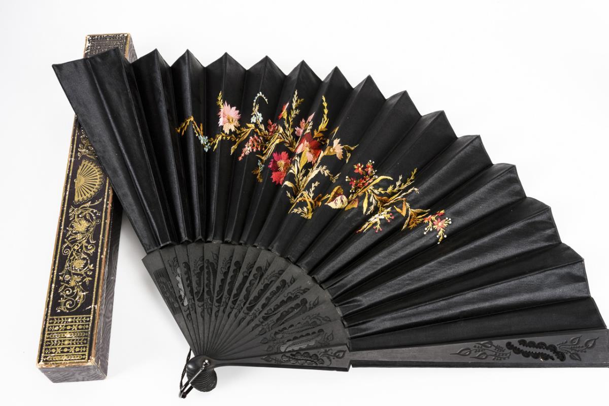 Ebonisiertes Holz mit Gravur, floral bestickte Seide. Bernsteinfarbener Kunststoff mit Piqué-Imitat, Gaze mit Pailletten. L maximal 35 cm (ohne Öse).