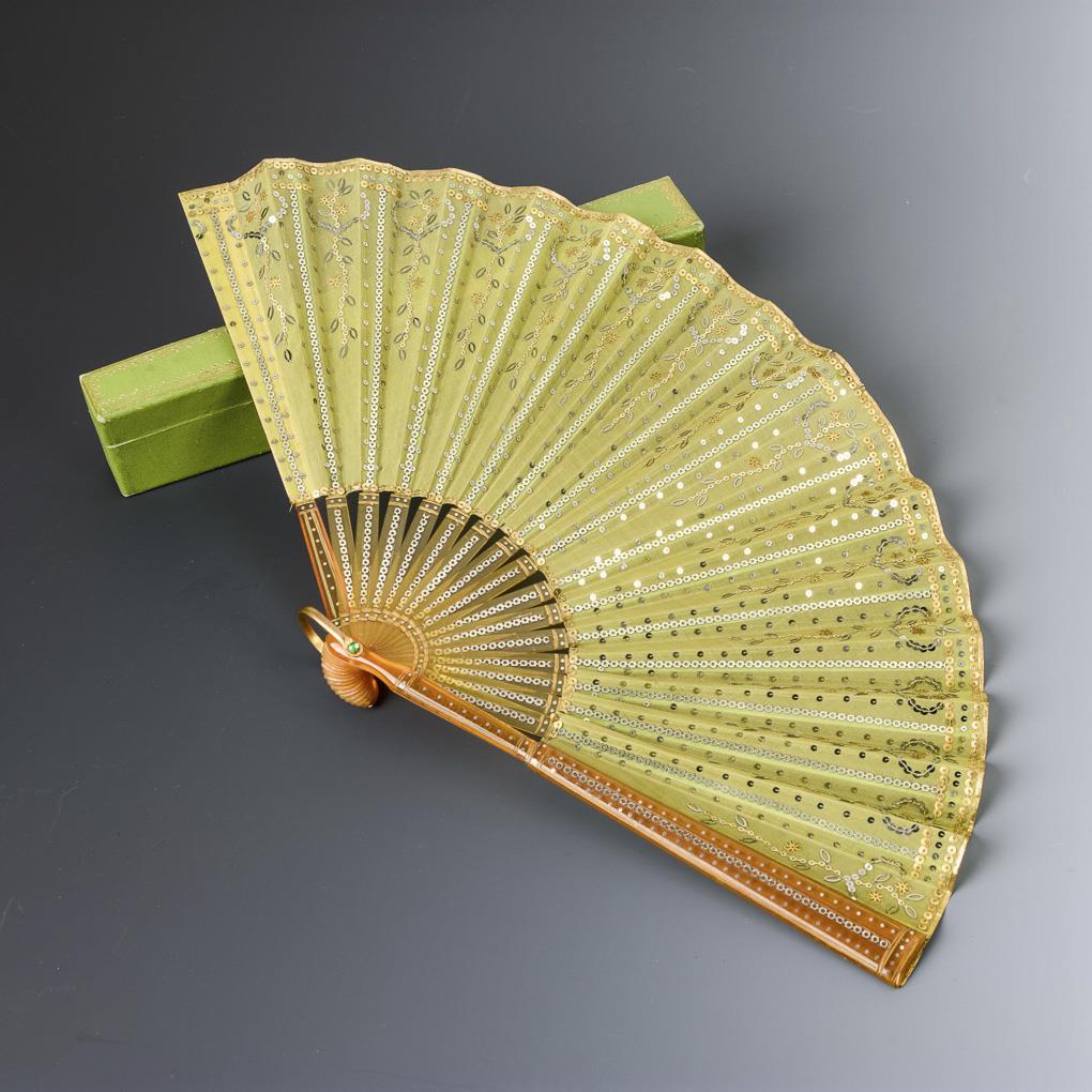 Stäbe mit teils à-jour gearbeiteter vegetabiler Gravur bzw. Metalleinlagen. Blätter mit farbfreudiger Stickerei bzw. gold- und silberfarbenem Pailletten-Ornament. Schwarzes und grünes Etui je mit Goldprägung. 1 Etui mit starken Alters-/Gebrauchsspuren.