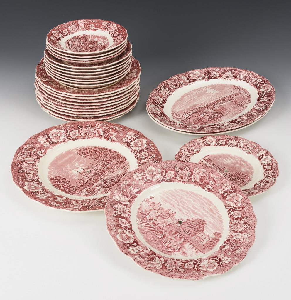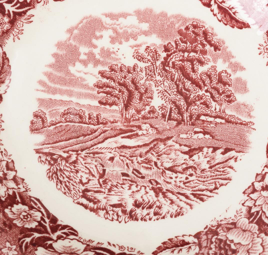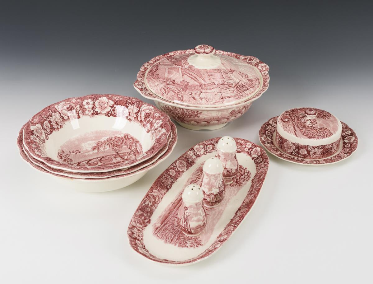 Steingut, weiß glasiert, eisenroter Umdruckdekor mit englischen Landschafts- und Stadtmotiven. H max. 19,5 cm, L max. 33 cm.