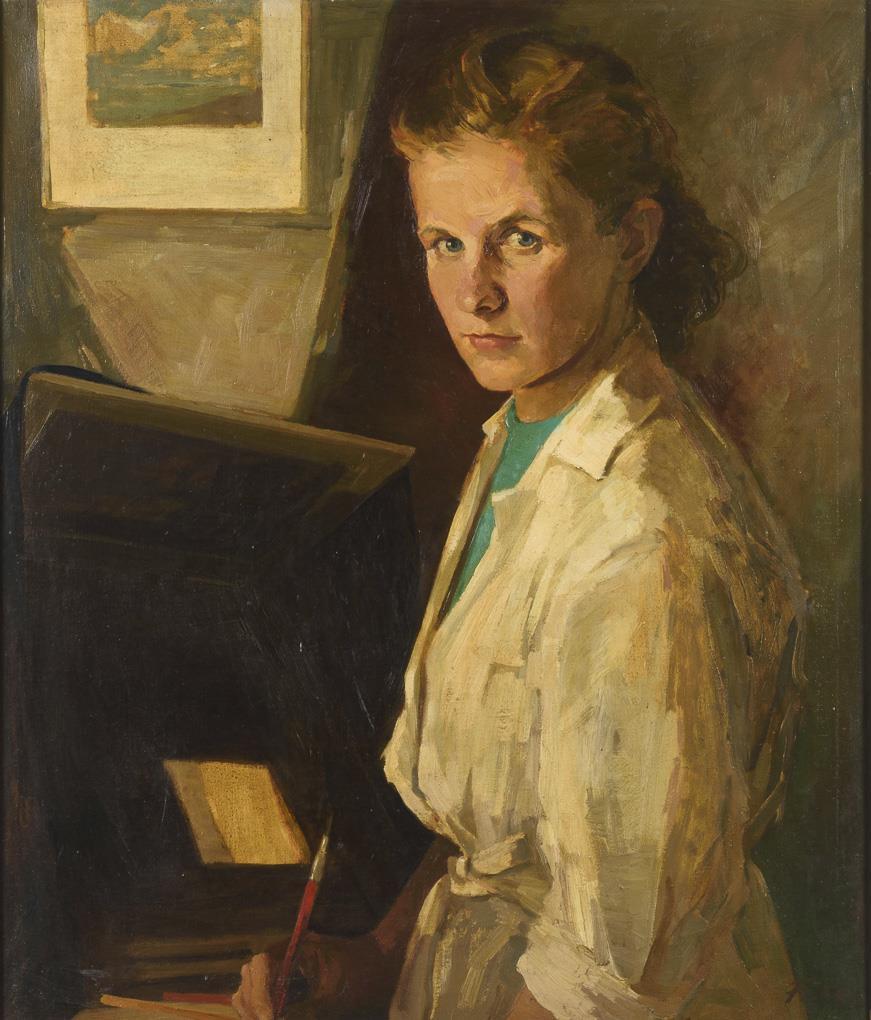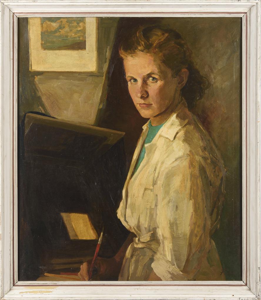 Bildnis einer jungen Frau mit Pinsel und in hellem Malerkittel.