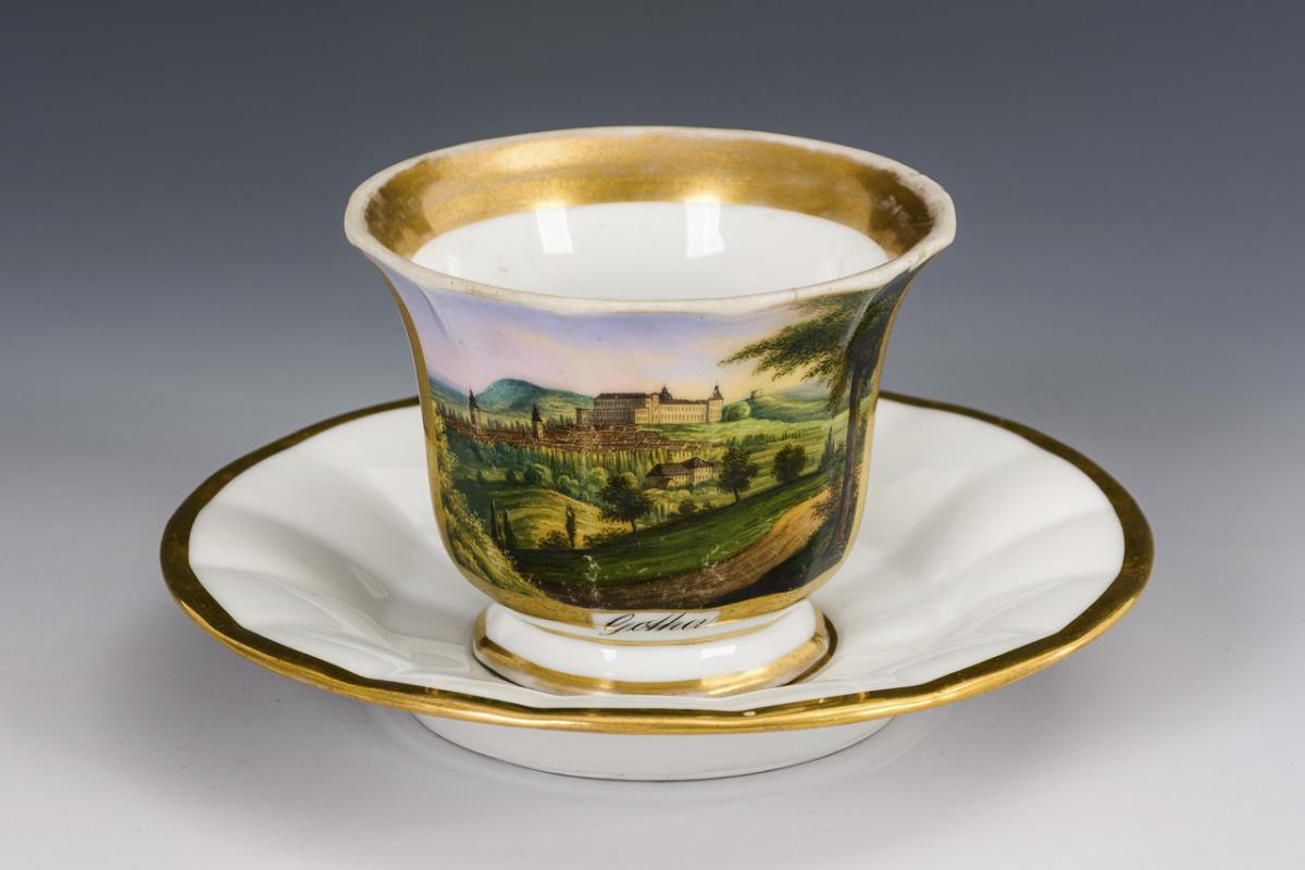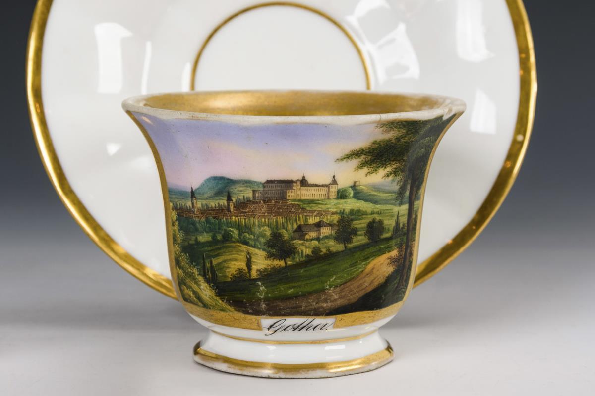 Gefußte, polygonale Glockentasse mit Ohrenhenkel. Schauseitig eine goldgerahmte Rechteckkartusche mit der bezeichneten Ansicht der Stadt Gotha mit Blick auf Schloss Friedenstein. Gold berieben, Chip am Mündungsrand, Kratzspuren auf der Malerei.