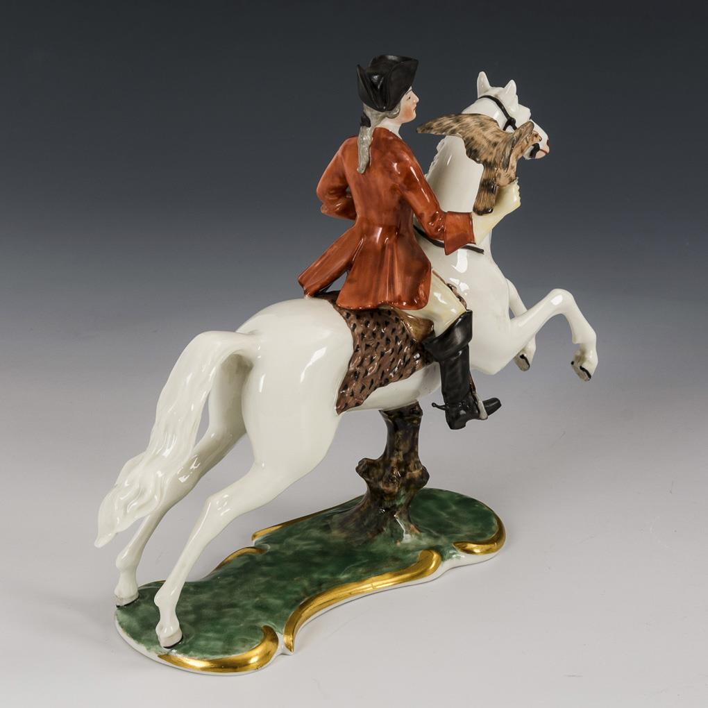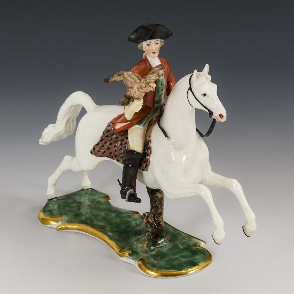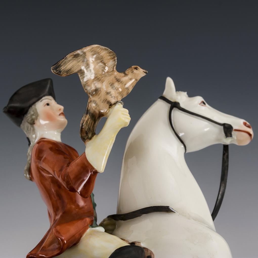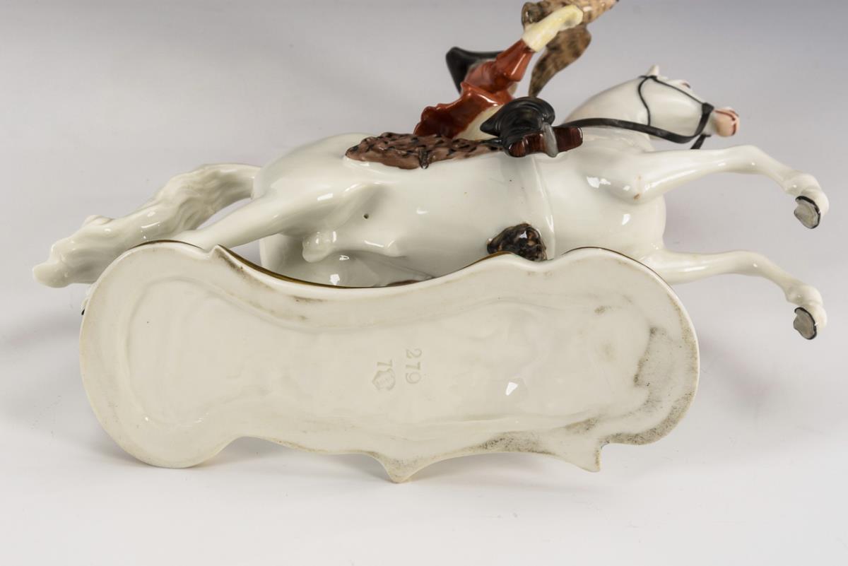 Falkner auf Schimmel, über einen Baumstamm springend. Rechte Hand geklebt, Zügel defekt.