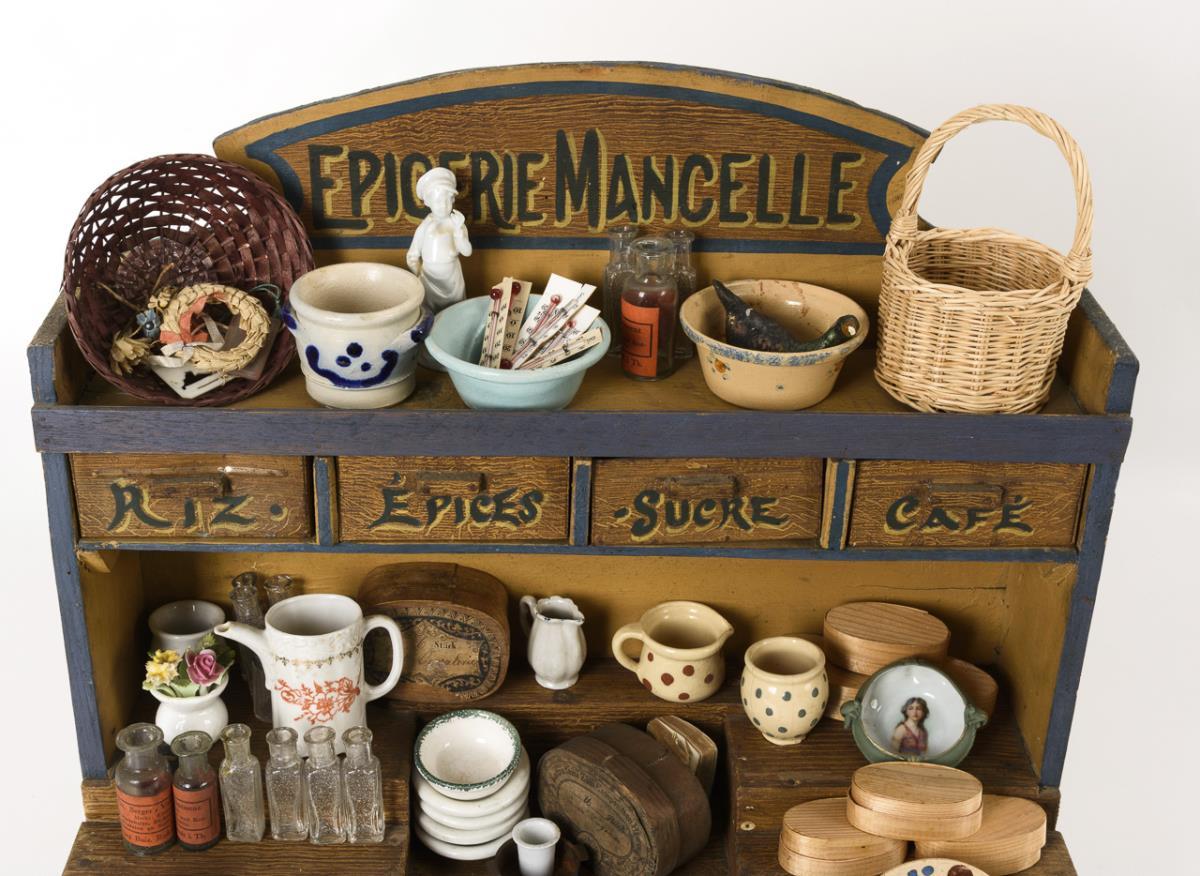Ladenfront mit gebogenem Abschluss, treppenartiger Auslage und 4 beschrifteten Blech-Schüben. Ergänztes deutsches Inventar: Keramik, Glas, Porzellan, Korb und einige Spanschachteln. Altersspuren.