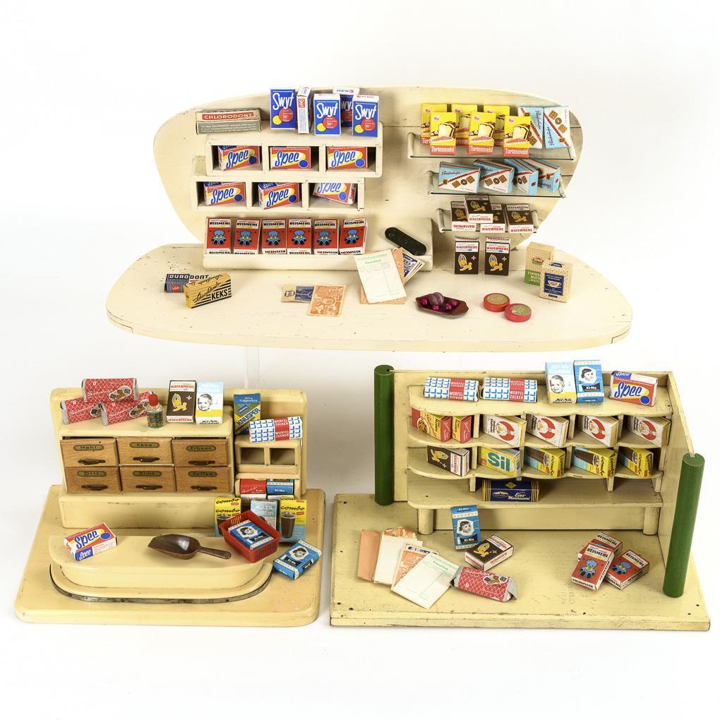 3 offene Kaufmanns-Läden mit festen Regal- bzw. Schubladen-Einbauten. 1x mit lose eingestellter Theke. Dazu einige Pappschachteln und Zubehör. Leichte Altersspuren.