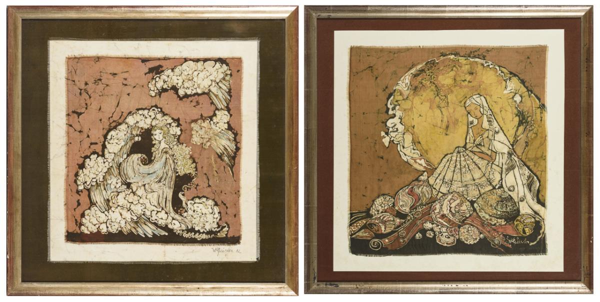 Nymphe mit Muscheln, im Stoff signiert, Stoff: 50,5 x 48 cm, gerahmt & hinter Glas: 70 x 69,5 cm | Nymphe mit Welle, Bleistiftsignatur auf äußerem Stoff, [19]82, Stoff gesamt: 49 x 46 cm, gerahmt & hinter Glas: 65 x 65 cm.