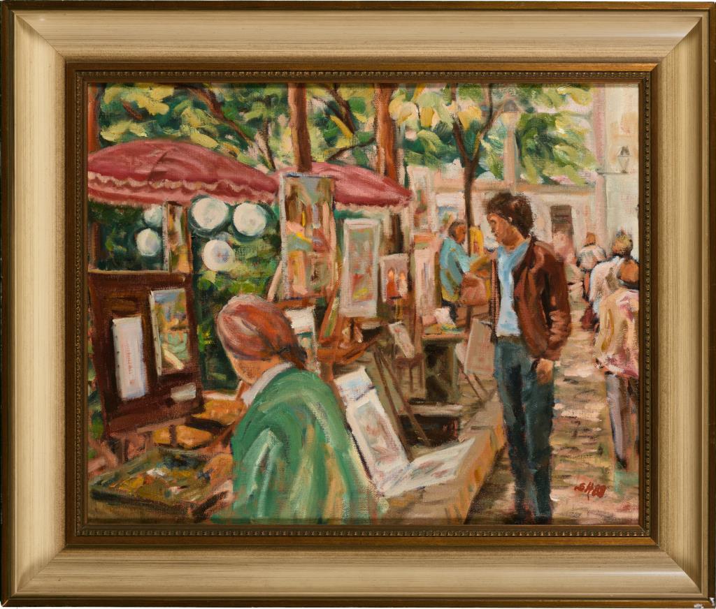 Künstler und Passanten an einem sonnigen Tag.