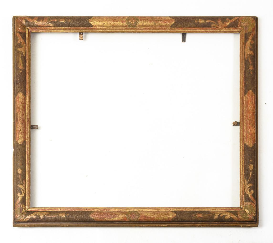 Breite, gewölbte und profilierte Holzleiste, kreidegrundiert, mit gewaffelten und rocaillenförmigen Ornamentflächen. Auf rotem Bolus blattvergoldet. Mit Retuschen und Altersschäden, Vergoldung teils auf rotem Bolus abgerieben.