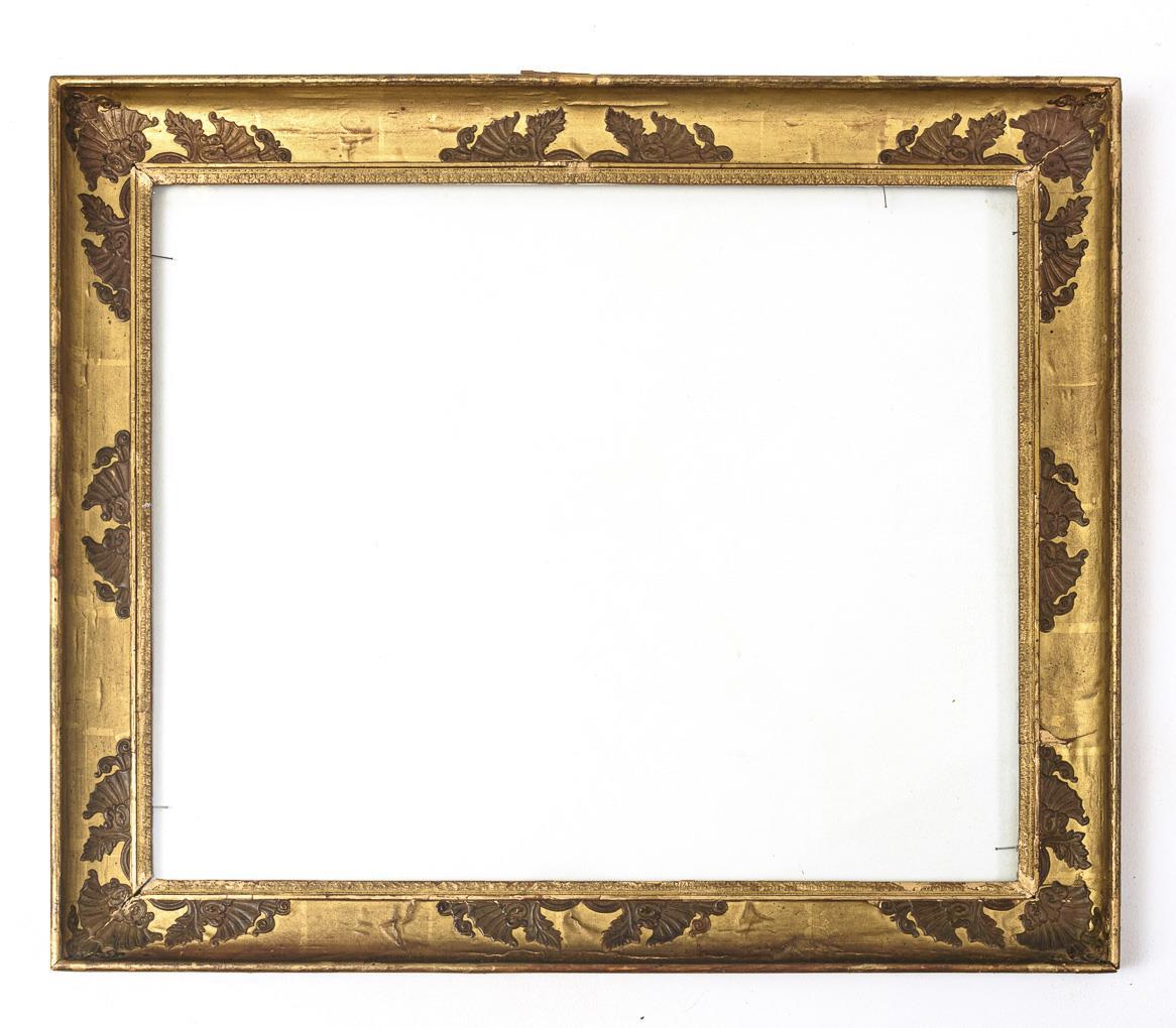Gekehlter Rahmen mit Palmetten-Applikationen. Papier-Fehlstellen und -Defekte, teils überbronziert, Alters-/Gebrauchsspuren.