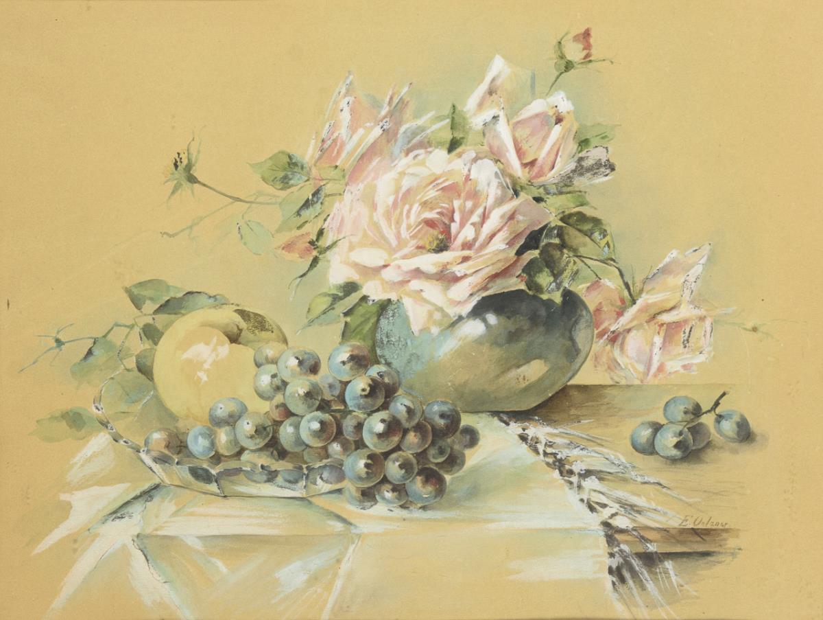 Kleiner Rosenstrauß in flacher Vase neben Apfel und Trauben im hellen Licht. Minimale Kratzer.