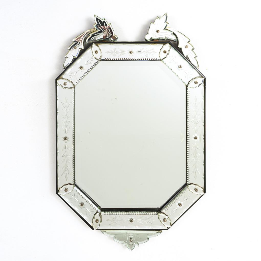 Oktogonaler Wandspiegel mit breitem Glasrahmen mit geschliffenem Blumendekor, bekrönt mit vegetabilen Glasapplikationen. Obere mittige Applikation fehlt, Alters-/Gebrauchsspuren.