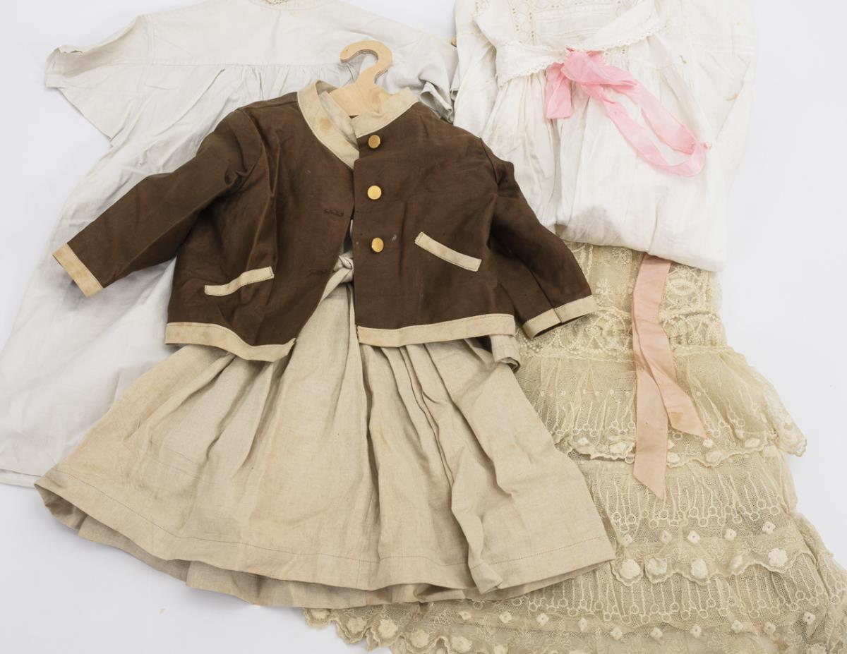 Verschiedene, meist weiße Kleidungsstücke, darunter Kleider und Blusen in Kindergröße. Anbei kleine Kunstblumensträußchen weiß, rosa und blau. Altersspuren.