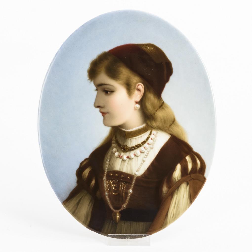 Ovale Platte mit dem fein gemalten Bildnis eines Mädchens in Renaissancekleidung.