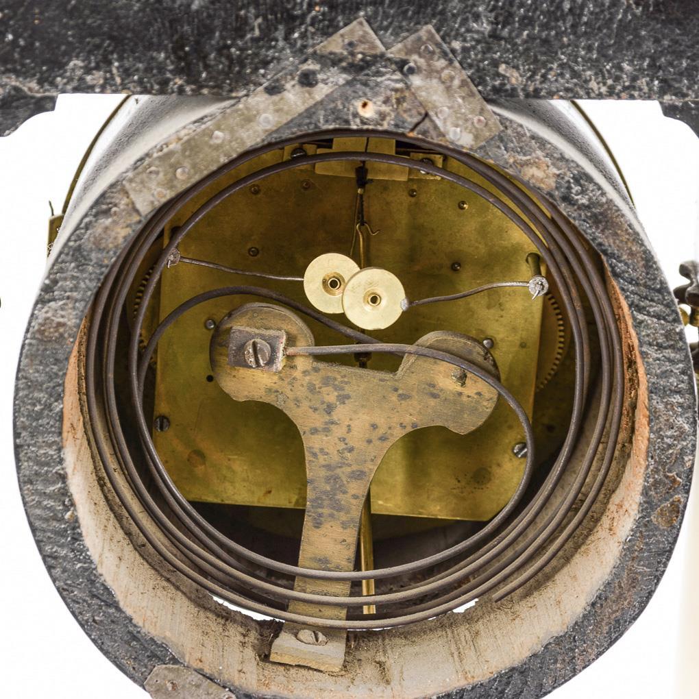 Profilierter Sockel mit 4 korinthischen Säulen und Bogengiebel. Restaurierungsbedürftiges Gehäuse und Zifferblatt mit Defekten, Fehlstellen, Lötspuren.