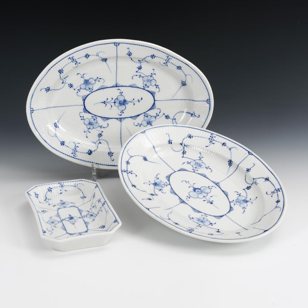 Gebrochen gerippte Wandung. 2 Ovalplatten (L 30,5 cm) und 1 Rechteckschale (11,5 x 19,5 cm).