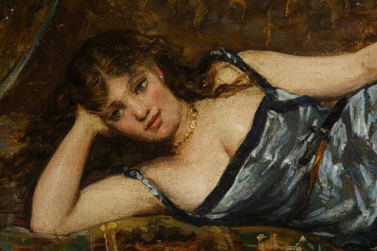 Auf einem Teppich mit Fächer liegende Frau im grau-blauen Kleidchen oder Negligé. Restauriert, mit drei kleinen Hinterklebungen.