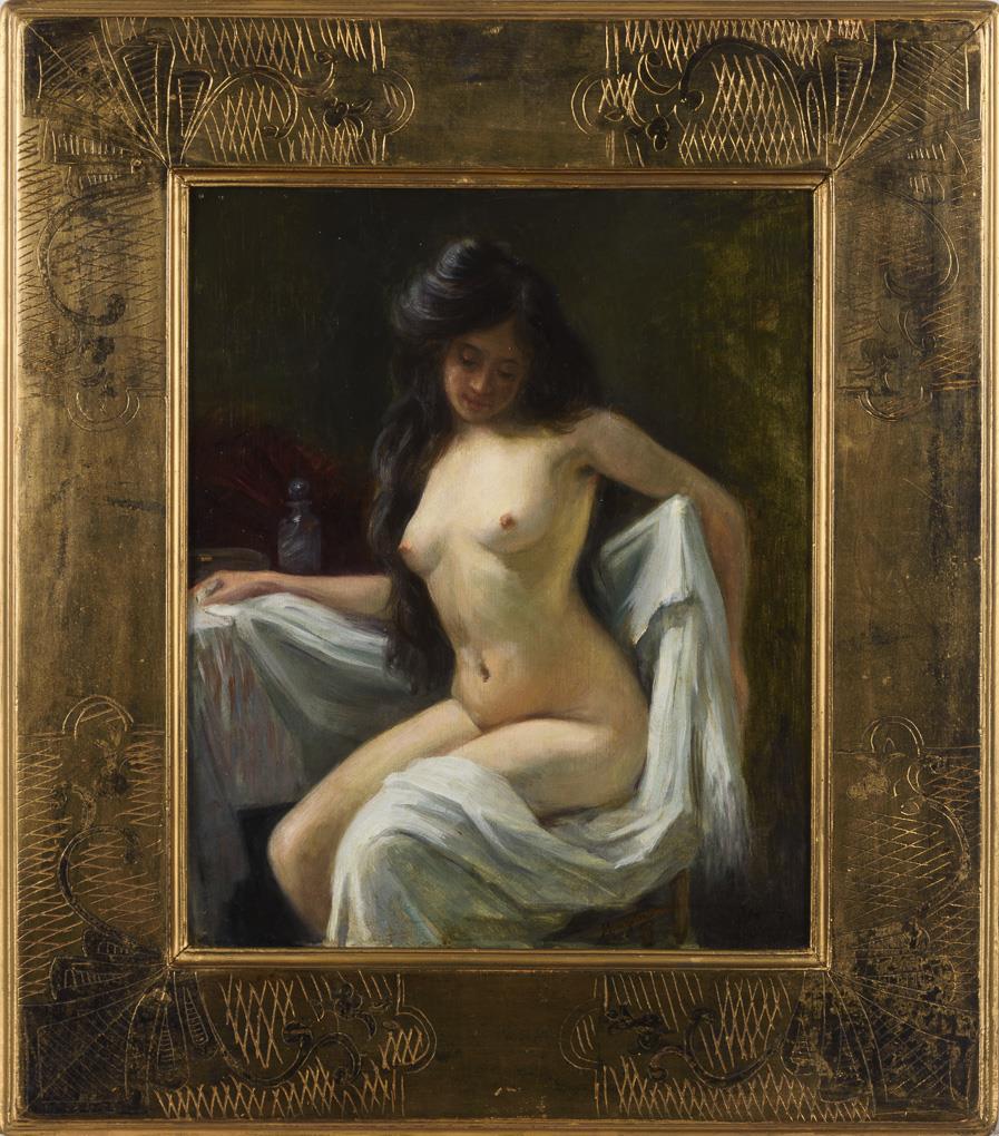 Nackte junge Frau mit weißem Laken auf einem Stuhl. Altersspuren.