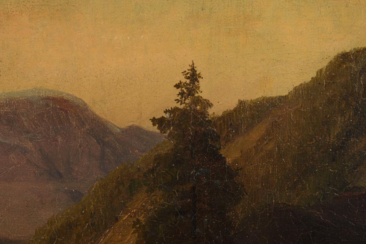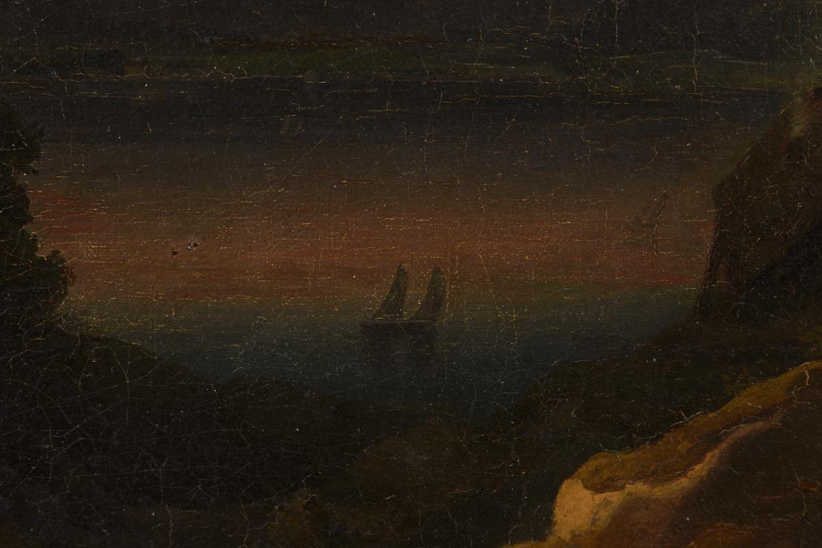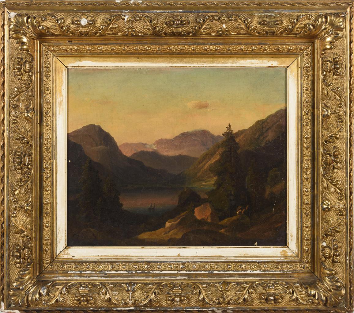 Staffagefiguren oberhalb eines Sees mit Seglern im idyllischen Abendlicht. Leinwand randdoubliert, Ein kleiner Defekt am Rand.