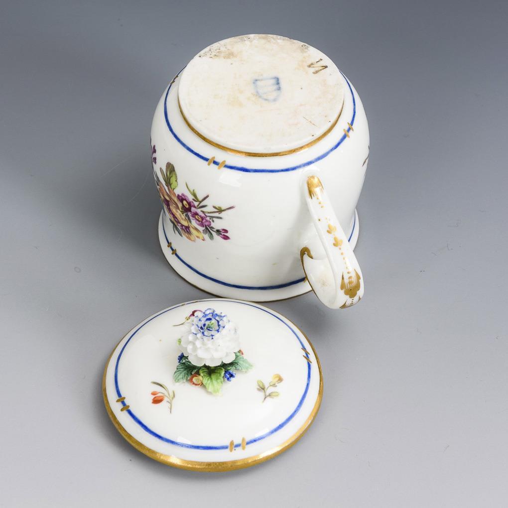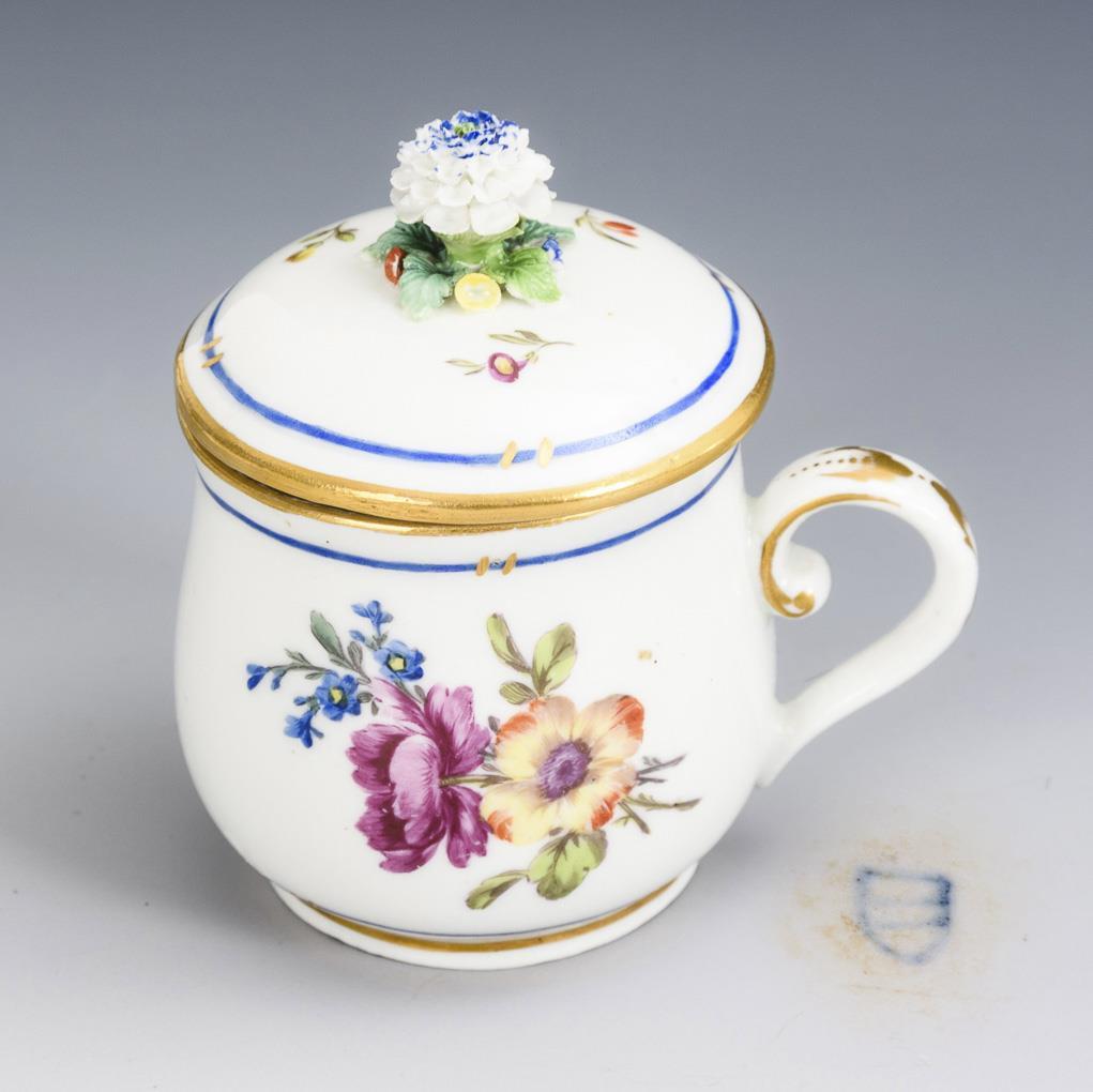 Tasse mit Ohrenhenkel und Blütenknaufdeckel, beidseitig ein Blumenbukett. Bestoßungen am Blütenknauf.