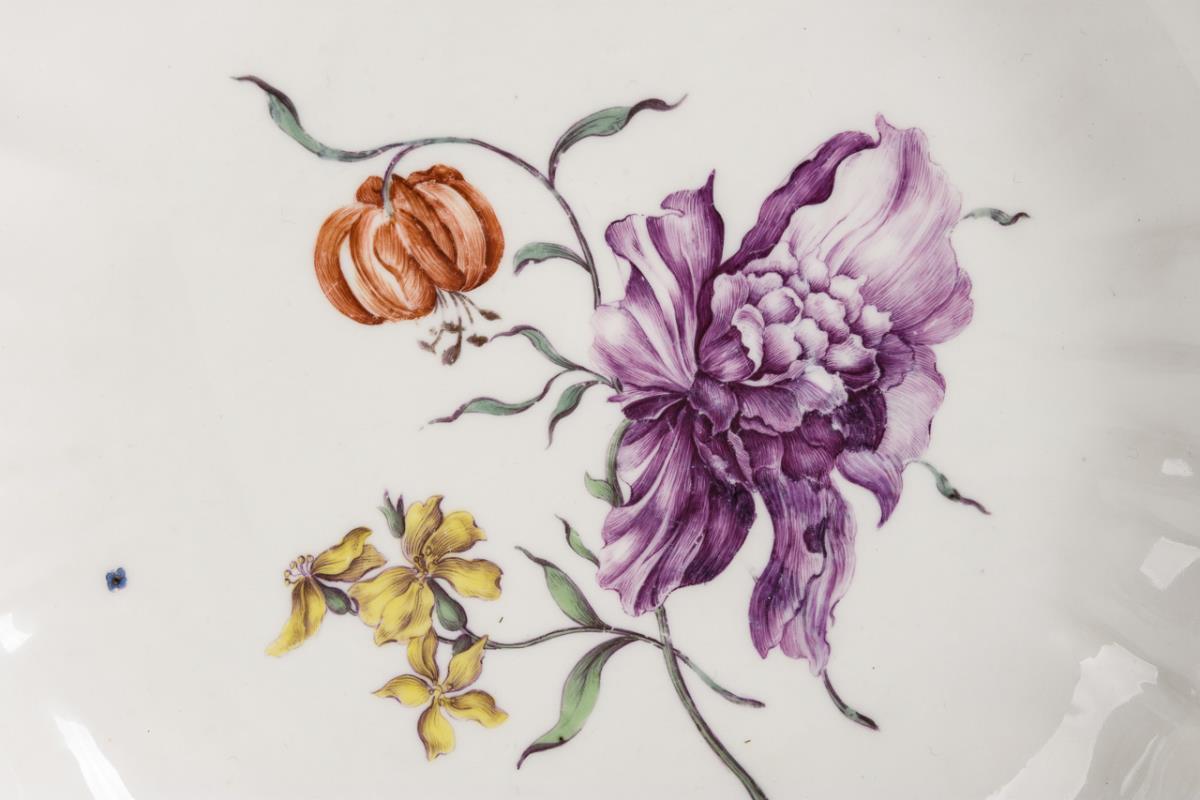 Suppenteller mit dem Reliefdekor "Altbrandenstein". Im Spiegel ein Blumenbukett mit Mohn und Türkenbundlilie. Gold berieben, Kratzspuren.