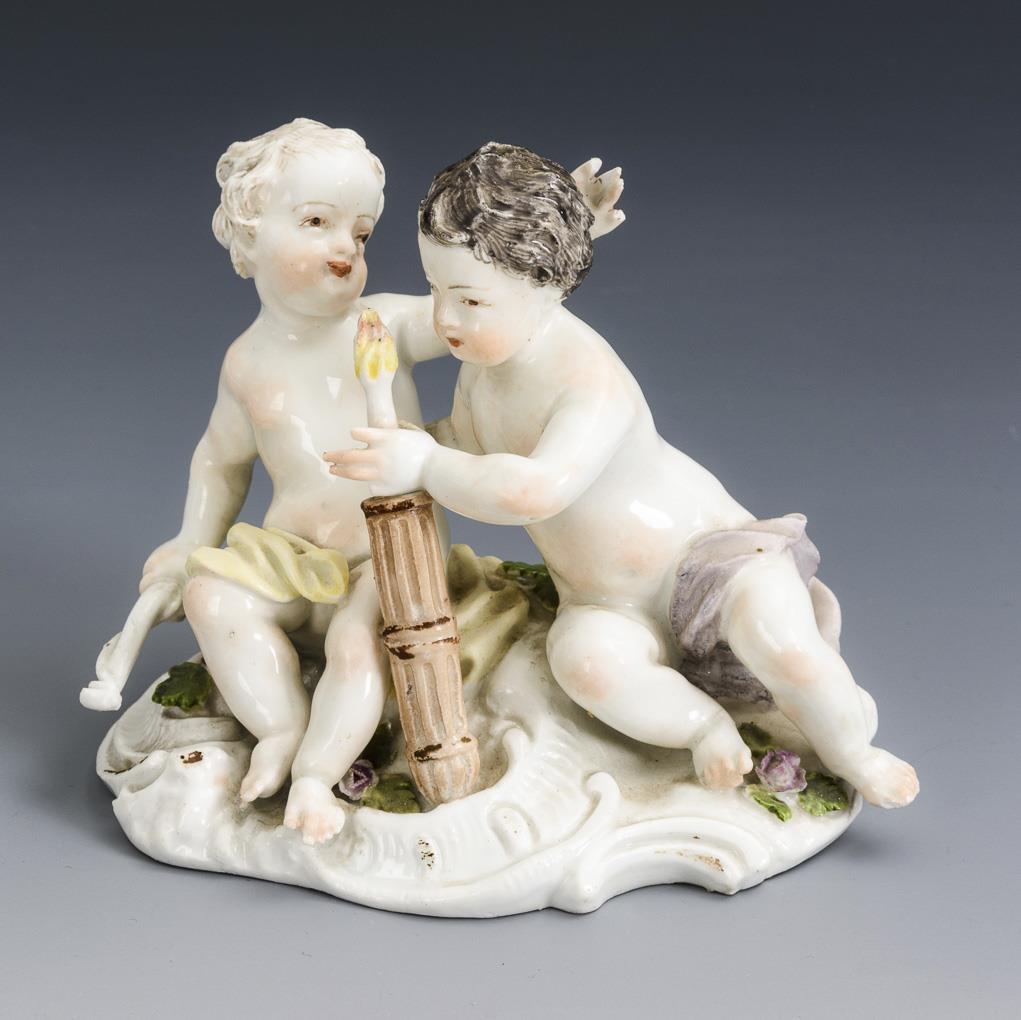 Zwei Putten mit Köcher, Fackel und Bogen. Brandriss am Sockelrand, Bestoßung an der Flammenspitze, einigen Fingerspitzen, 1 Fuß und am Bogen.