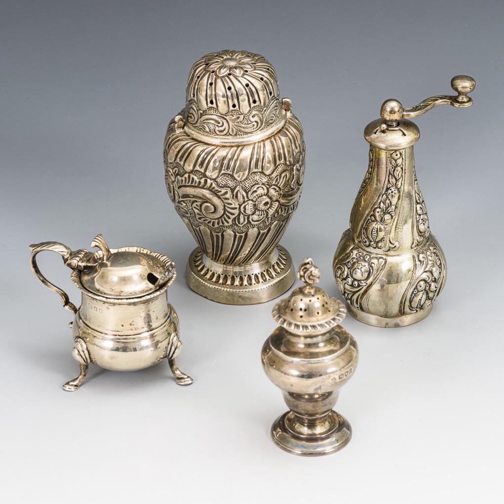 Großer und kleiner Streuer, kleine Pfeffermühle und Senftöpfchen mit Löffel. Gebrauchsspuren, teils etwas gedellt.