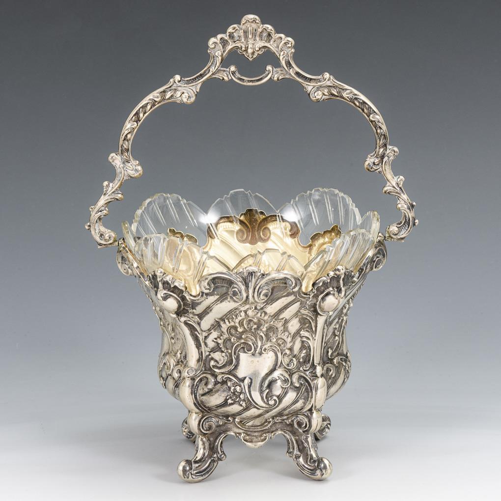 Vierpassige Reliefschale mit historistischem Rocailledekor, leeren Wappenreserven und Bügelhenkel, auf 4 Füßchen. Mit passendem Glaseinsatz.