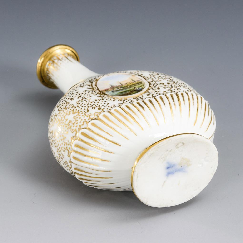 Geplattet-runder, am Ansatz zungenbandreliefierter Korpus mit schlankem Hals und zungenbandreliefiertem Fuß. Beidseitig zwei kleine Medaillons mit farbig gemalten Miniaturansichten (u.a. Dresden), reich goldstaffiert. Ohne Stopfen. Minimaler Goldabrieb, seitlich am Hals herstellungsbedingter Brandriss unter der Glasur.