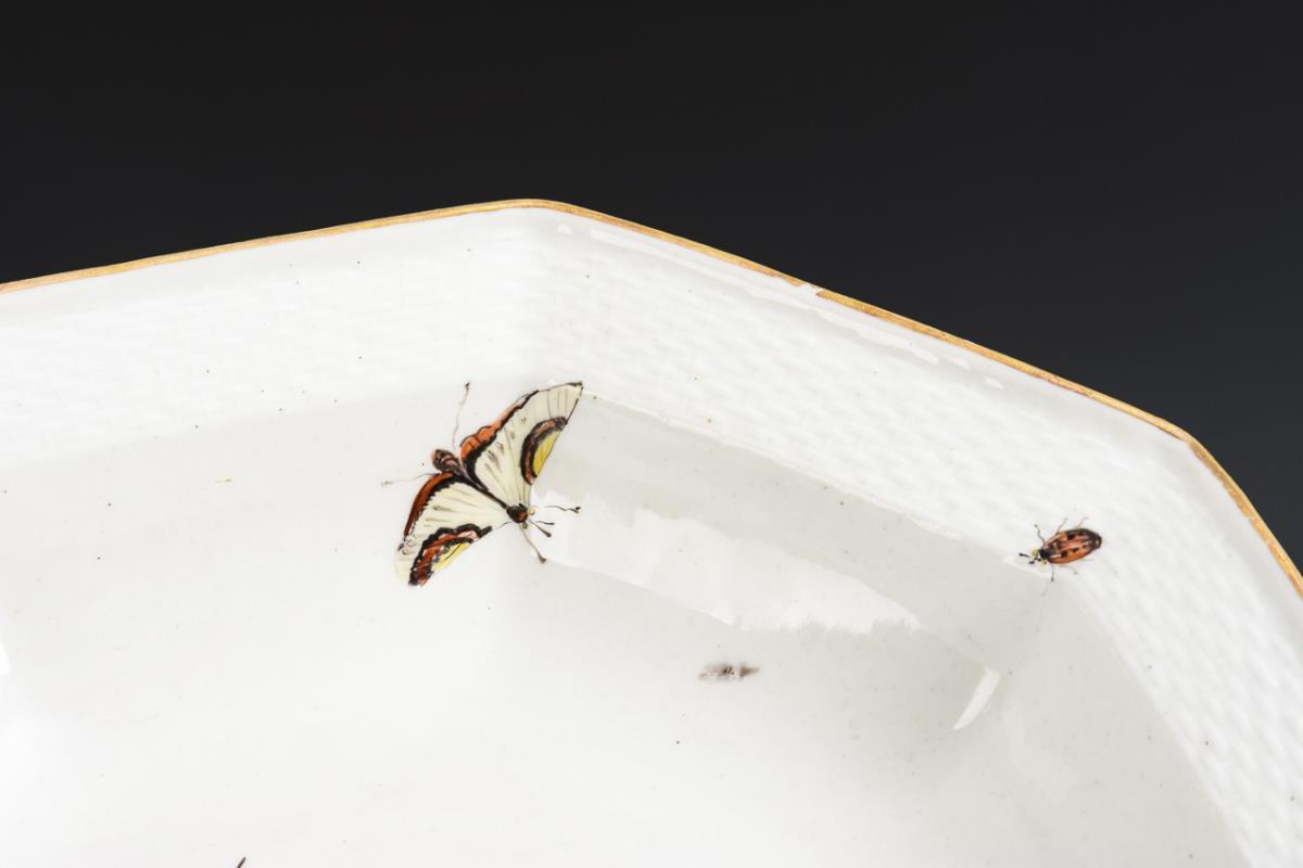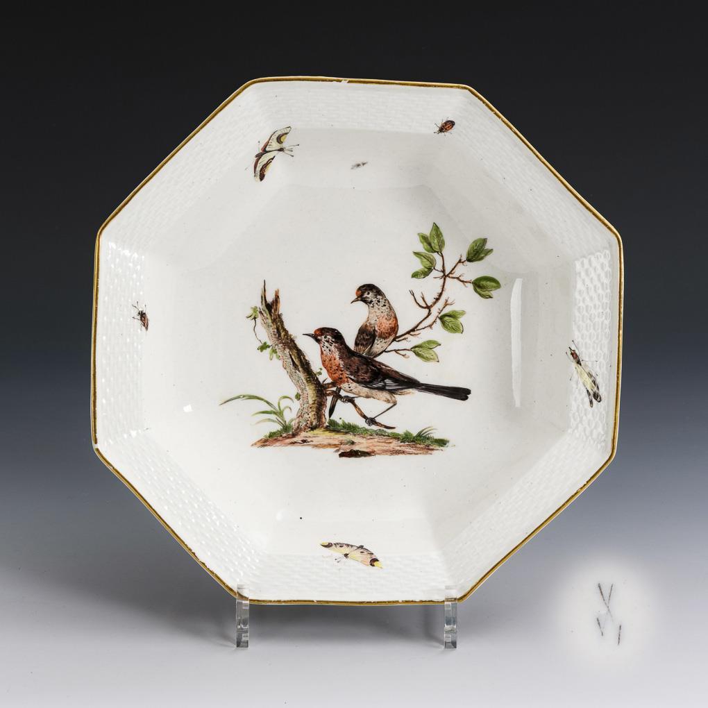 Form "Altozier". Oktogonale Schale, im Spiegel eine Vogelpaar in einem Baum, auf der Fahne Insekten. Minimaler Goldabrieb.