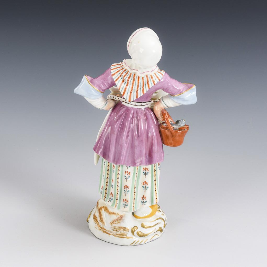 Pariser Ausruferin, auf einem Tablett Fische präsentierend. Sockel mit Schuhen, Taille, rechte Hand und Topf restauriert.