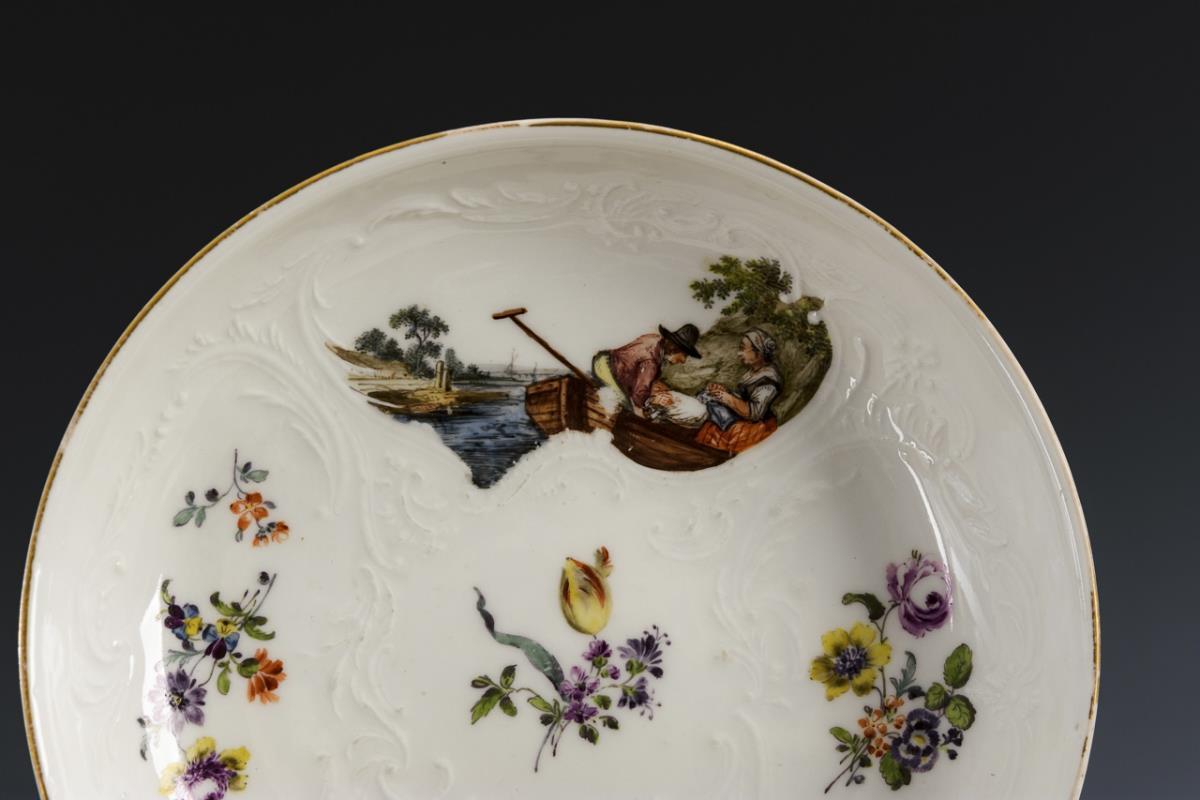 In Rocaillekartuschen die Darstellung von kleinen Landschaften mit Bauern bzw. kleinen Blumenbuketts. Gold berieben, kleine Bestoßungen am Standring der Tasse.
