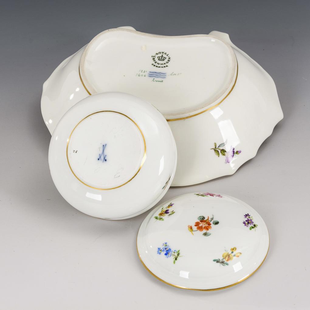 1x gemarkt Meissen, ab ca. 1850-1918, 1. Wahl: gedrückt gebauchte Dose mit Streublümchenmalerei. / 1x gemarkt Royal Copenhagen, 1962: Schale in Form einer Muschel mit Altozierrelief und Blumenbuketts.