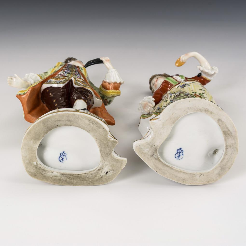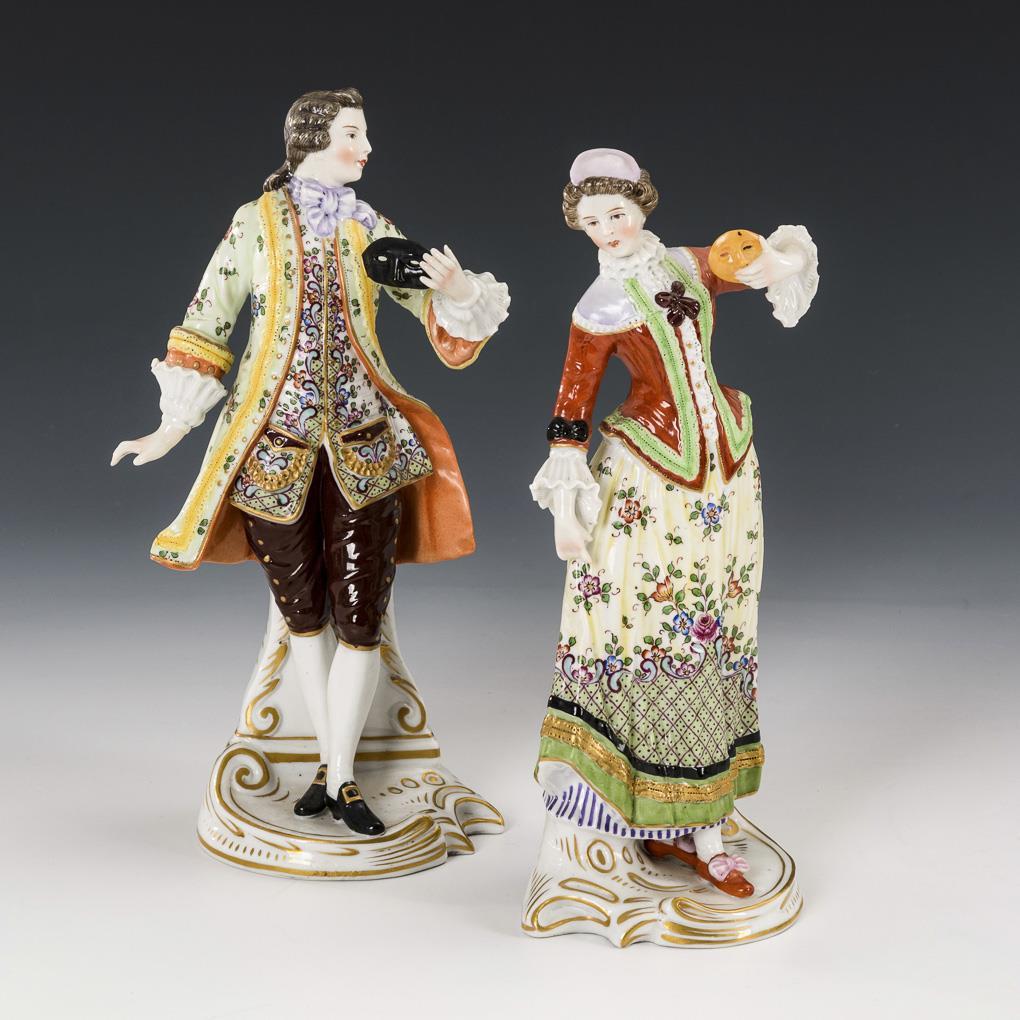 Je auf einem Rocaillesockel stehende junge Dame bzwe. junger Herr mit Maske. 1 Finger des Herren geklebt.