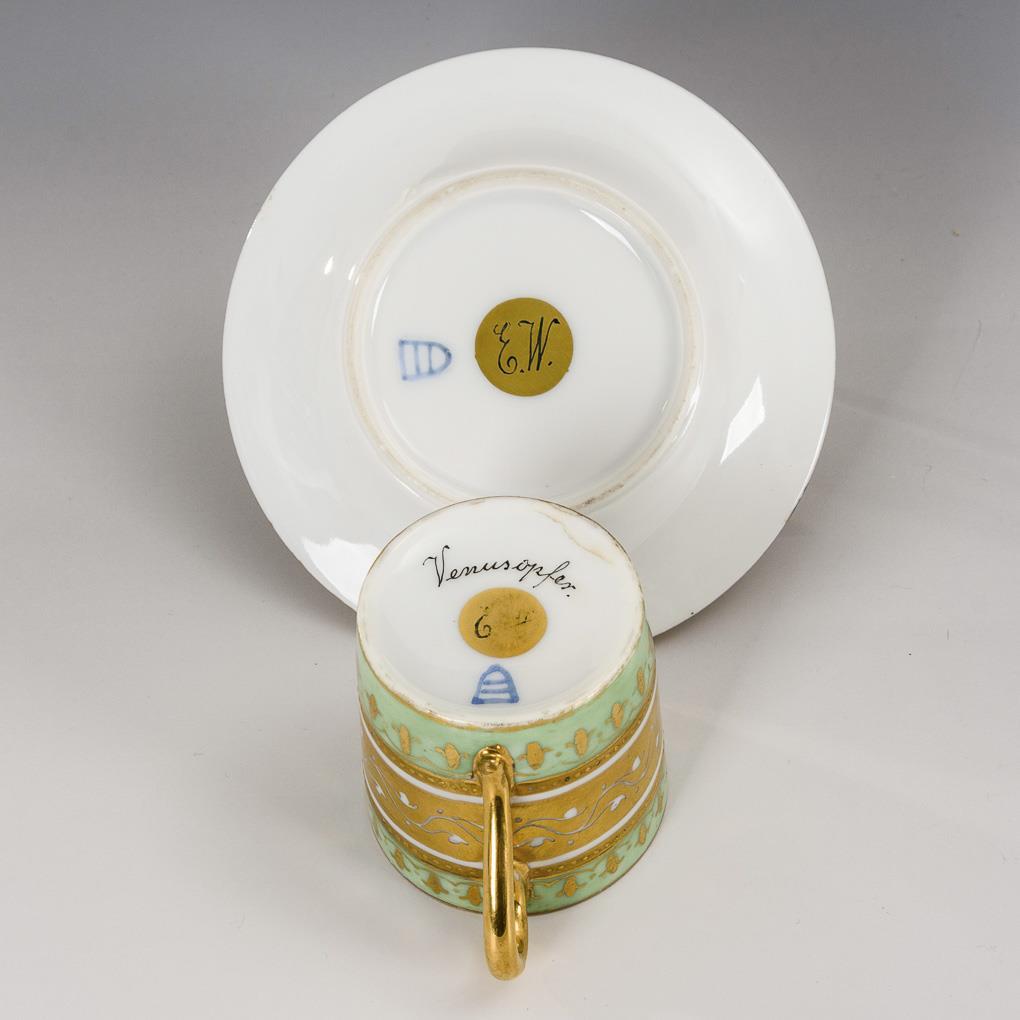 Zylindertasse mit Ohrenhenkel. Mintgrüner Teilfond mit Perlband und Goldmalerei, schauseitig eine Rechteckkartusche mit der Darstellung einer mythologischen Szene, unterseitig bezeichnet "Venusopfer", innen vergoldet. Haarriss unterseitig am Stand, Kratzspuren auf der Malerei.