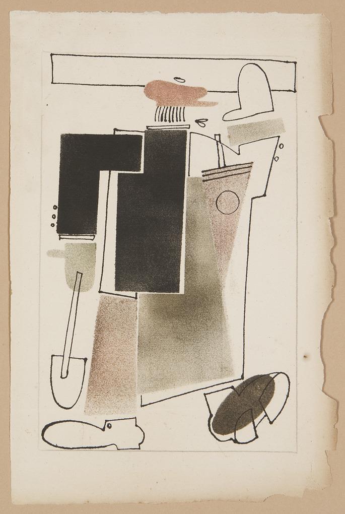Auf eine strenge Struktur reduziert, die dargestellten Figuren sind in geometrische Teile zergliedert. Passepartout, profilierter Rahmen. Ränder ausgefranst.