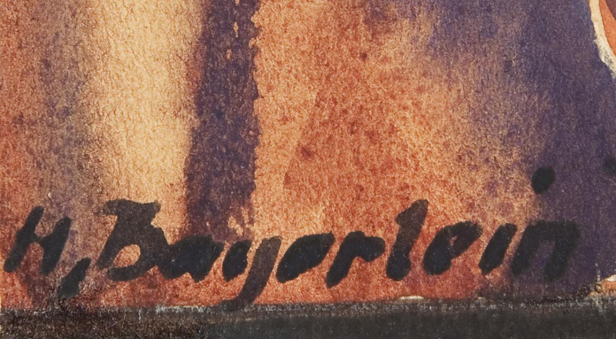 Bayerlein, Genremaler, Aquarellist, Freskant. Studierte an der Akademie in München. Schüler von Hugo von Habermann. Übernahm 1929 die väterliche Werkstatt für Kirchen-Restaurierung * Partnerauktion Bergmann.