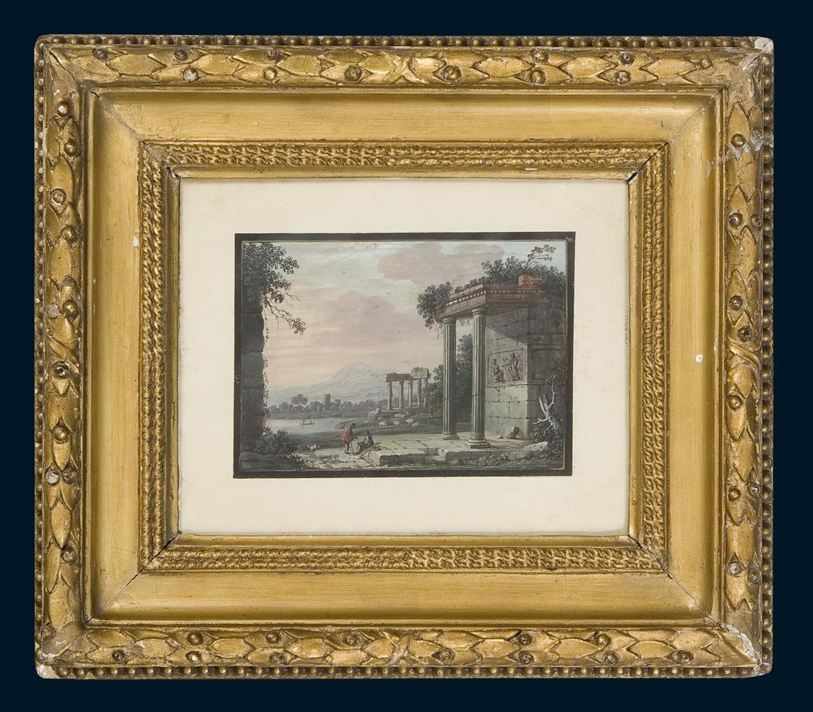 Minutiös gemalte, kleinformatige Ansicht. Rückseitig bezeichnet, Sammlungs-Stempel. Verglaster vergoldeter Stuckrahmen. Rahmen partiell defekt.