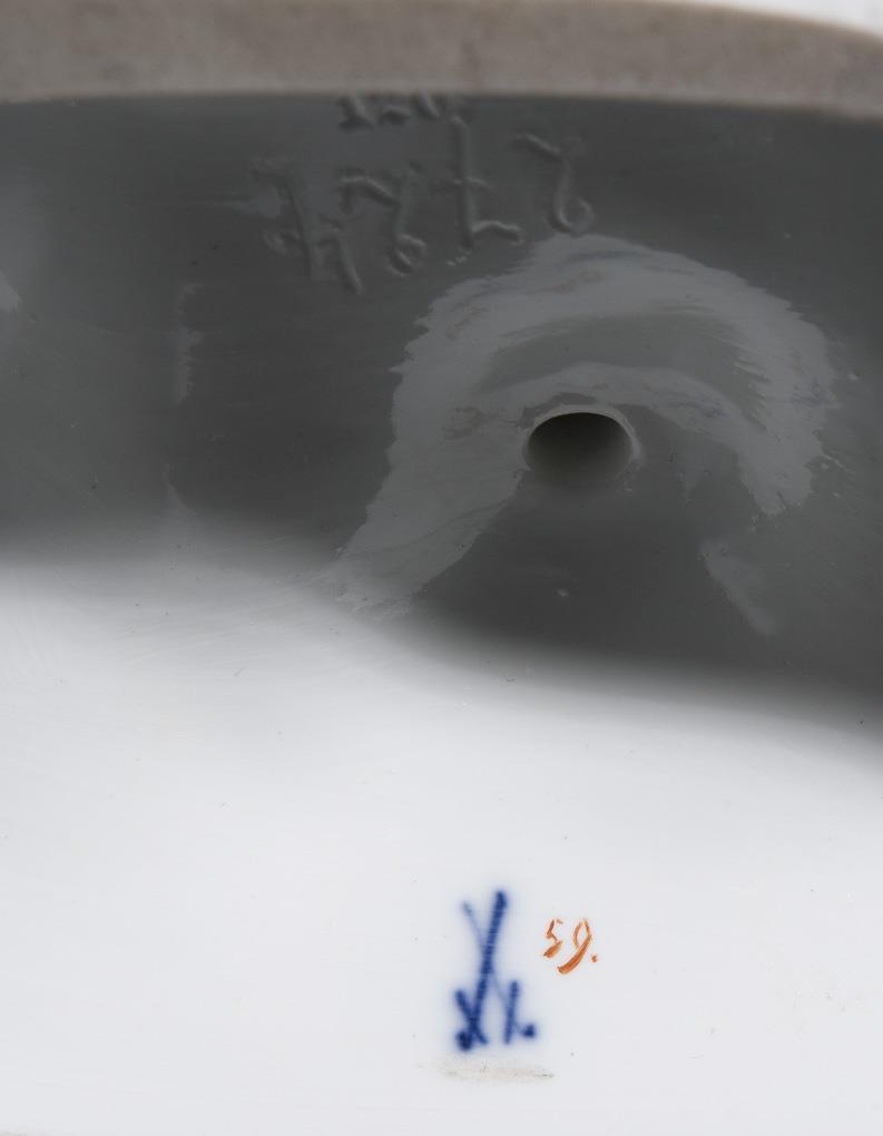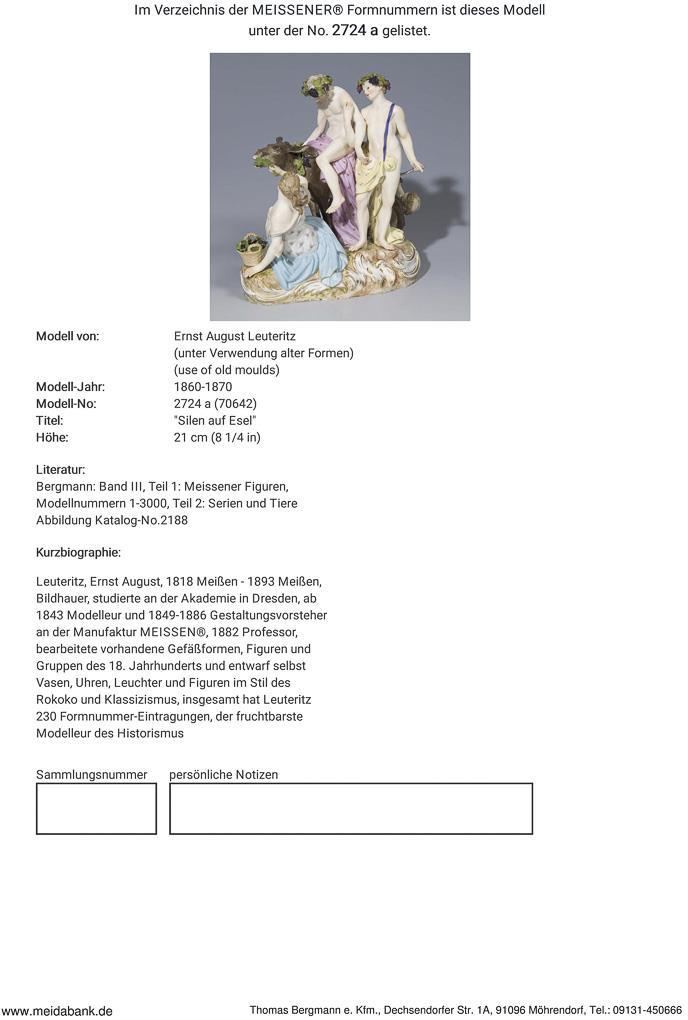 Modell von Ernst August Leuteritz 1860-1870 (unter Verwendung alter Formen). Farbig bemalt, gold staffiert. Ritzmarke, Pressmarke, Malermarke, Schwertermarke einmal gestrichen. Schwanz, eine Hand der Amorette, Schild, eine Hand des Silen, Eselsohren, einige Trauben, Blätter, Stola, Zapfen restauriert, Bacchusstab fehlt, Zehen an einem Fuß, ein Eselsohr geklebt, Haarriss im Oberarm des Silen, ein Fuß von unten, einige Blätter bestoßen.
