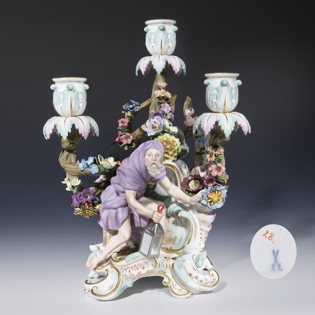 Modell von Johann Joachim Kaendler und Mitarbeiter 1748. "Diogenes" mit seinem Fass und Laterne. Pendant zu "Figurenleuchter-Paracelsus". Farbig bemalt, gold staffiert. Ritzmarke, Pressmarke, Malermarke, Schwertermarke. Blüten, eine Hand, Tüllenmontierungen, einige Blätter der Tropfschalen, Laternenknauf, ein Daumen restauriert, eine Palmenblattspitze bestoßen, kleiner Brandriss im Sockel.